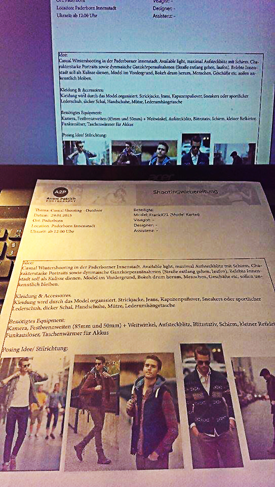 Ab dem 27.01.2015 gehe ich auf deutschlandweite Shootingtour. Zunächst habe ich mir einen Zeitplan erstellt, wann ich in welcher Stadt bin. Daraufhin habe ich dann bei Facebook in verschiedenen Gruppen (Modelnest, tfp Shootingbörse etc.) und in der Modelkartei Ausschreibungen für die entsprechenden Shootings gemacht. Wie eine vernünftige Jobausschreibung aussehen kann, werde ich nochmal in einem anderen Blogeintrag thematisieren. Dann sammel ich alle Bewerbungen und schaue welches Model am besten zu meinem Projekt passt. Ich informiere dann das Model per Mail und schreibe eine Absage an alle anderen Bewerber. Nehmt euch unbedingt die Zeit, Absagen zu schreiben, die Models haben schließlich auch Zeit in ihre Bewerbung an euch gesteckt!
