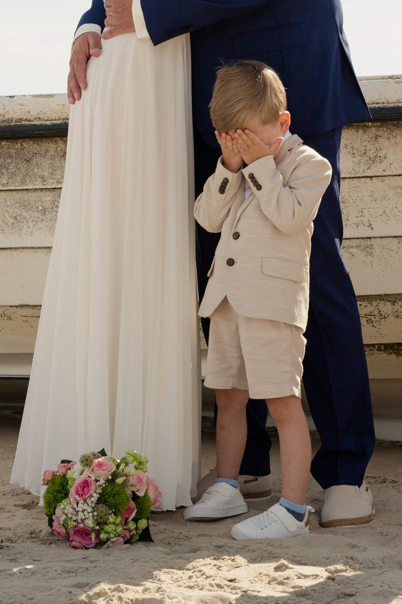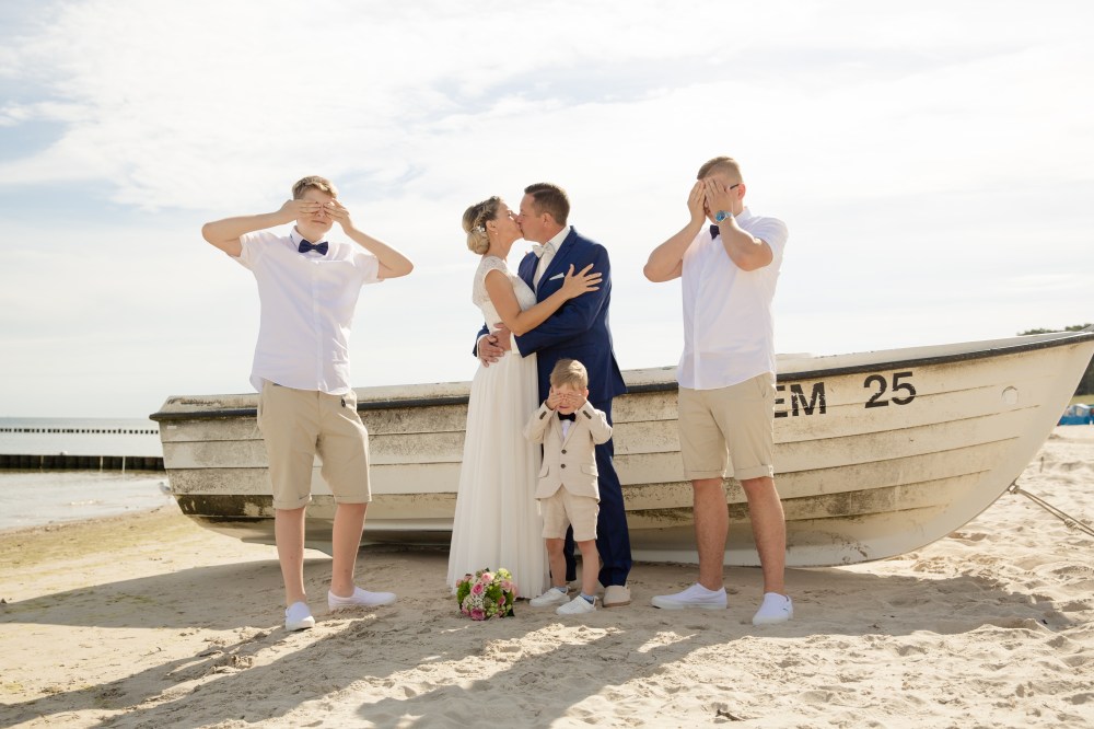 Auch Janine und Edgar konnte ich von dieser Idee überzeugen. Mit drei coolen Jungs, kamen die fast frisch Vermählten im Inselnorden an. Für das Shooting trafen wir uns in Zempin, meinem Lieblingsstrand auf Usedom. Für das Nesthäkchen gab es hier allerhand zu entdecken. Fischerboote, Fischerhütten, Muscheln, Buhnen… da war es gar nicht so einfach, die Aufmerksamkeit auf die Kamera zu lenken. Aber seine beiden großen Brüder, haben ihn supermotiviert und zum Mitmachen bewegt.
