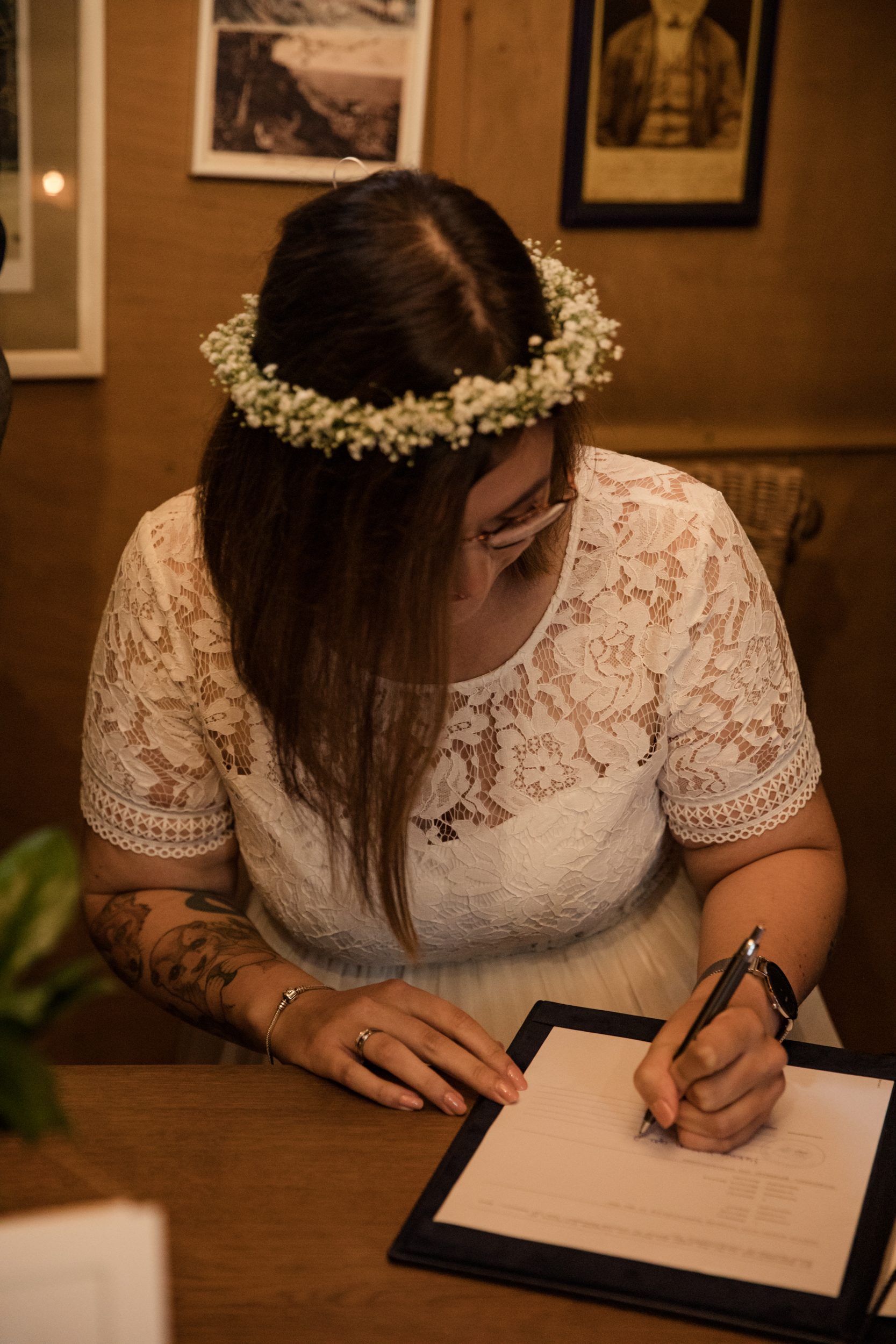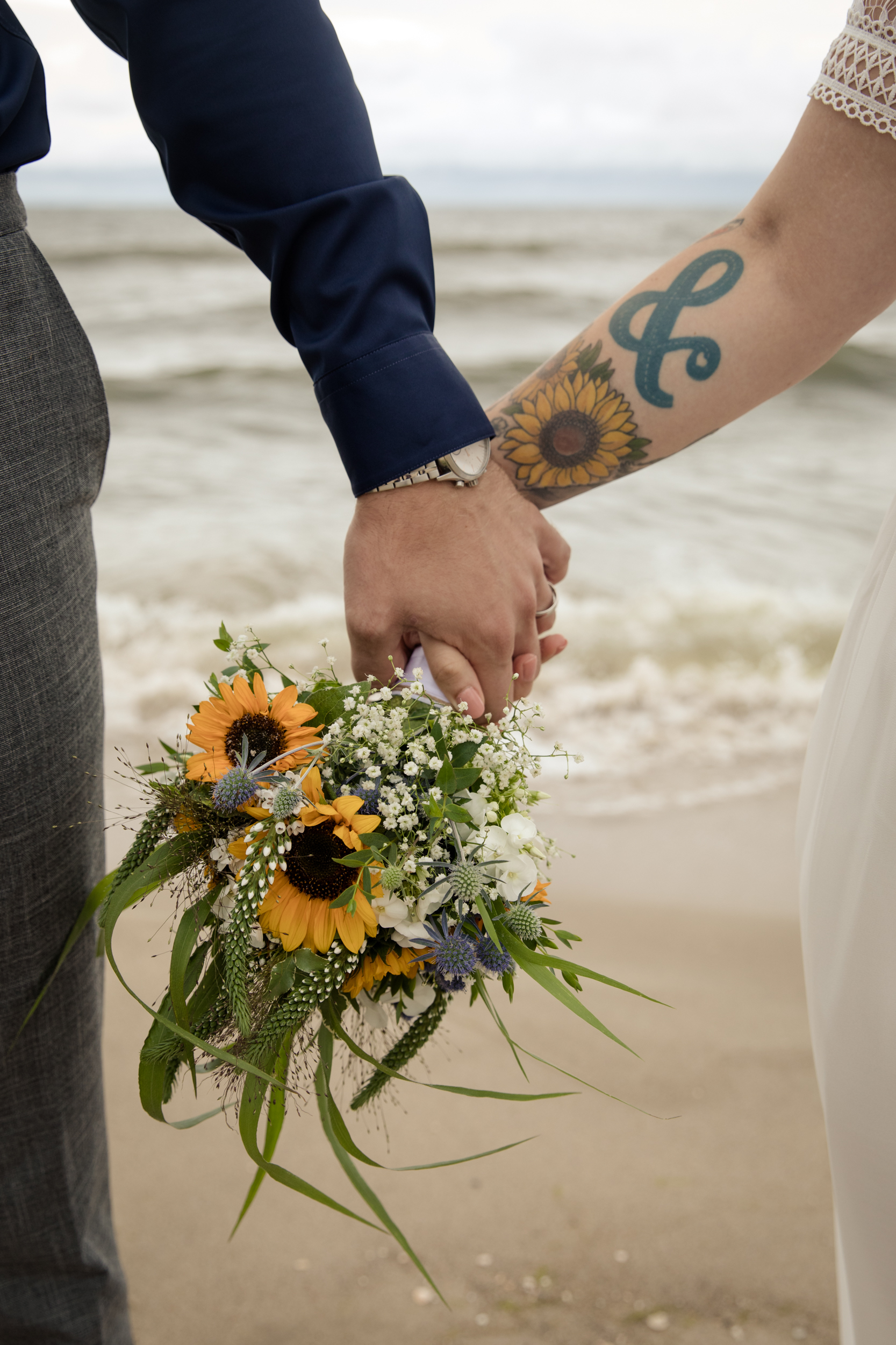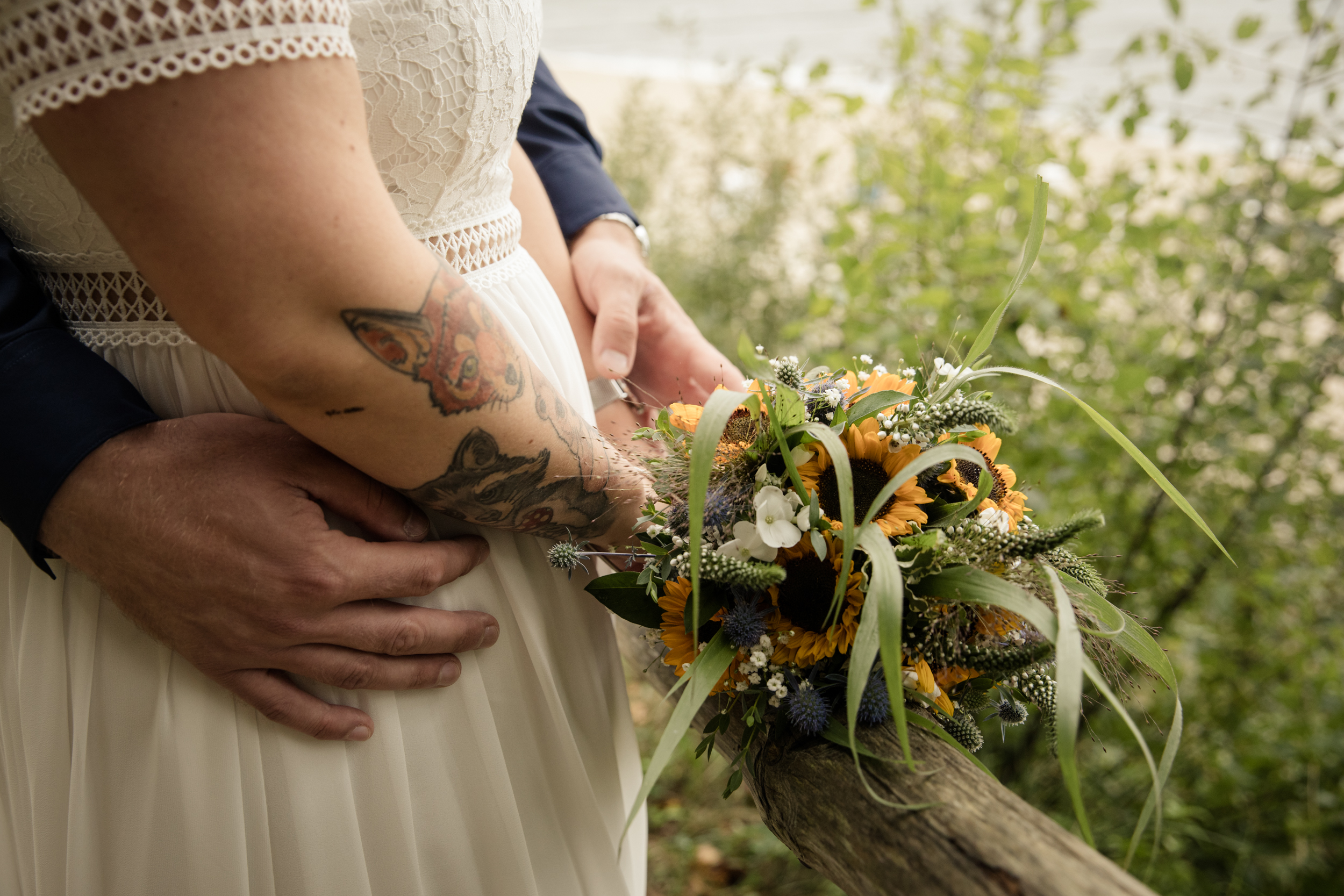Zur Stärkung gab es im Anschluss noch ein echt norddeutsches Flens. Und mal ganz ehrlich, wie toll ist es, dass der Brautstrauß perfekt zum Tattoo passt?