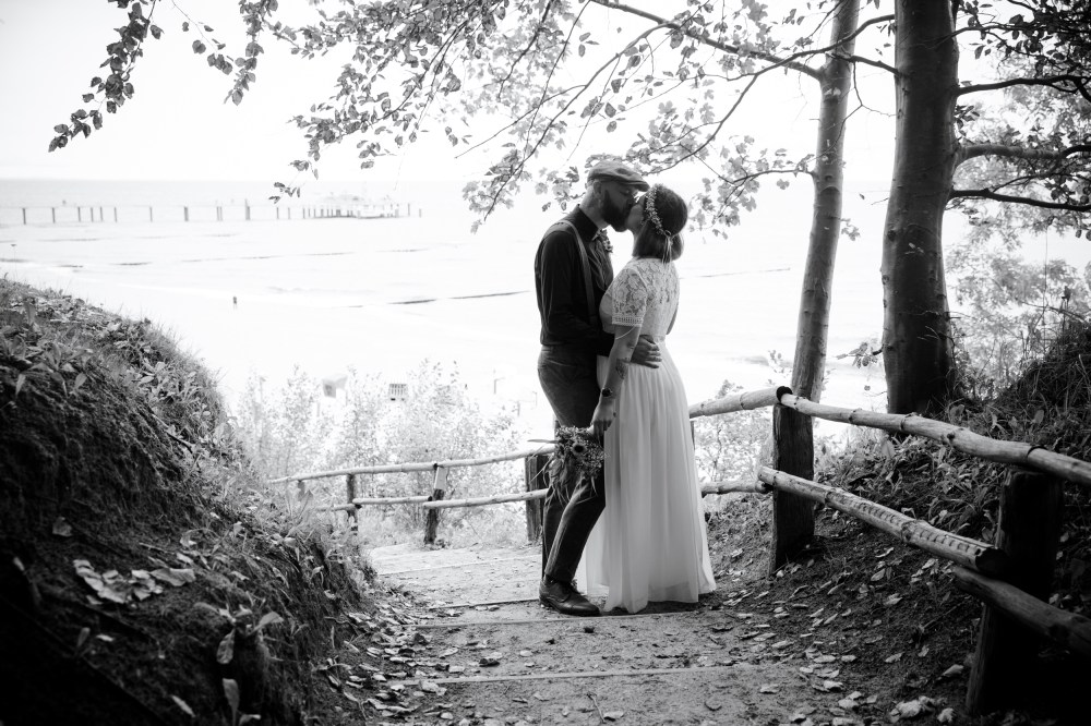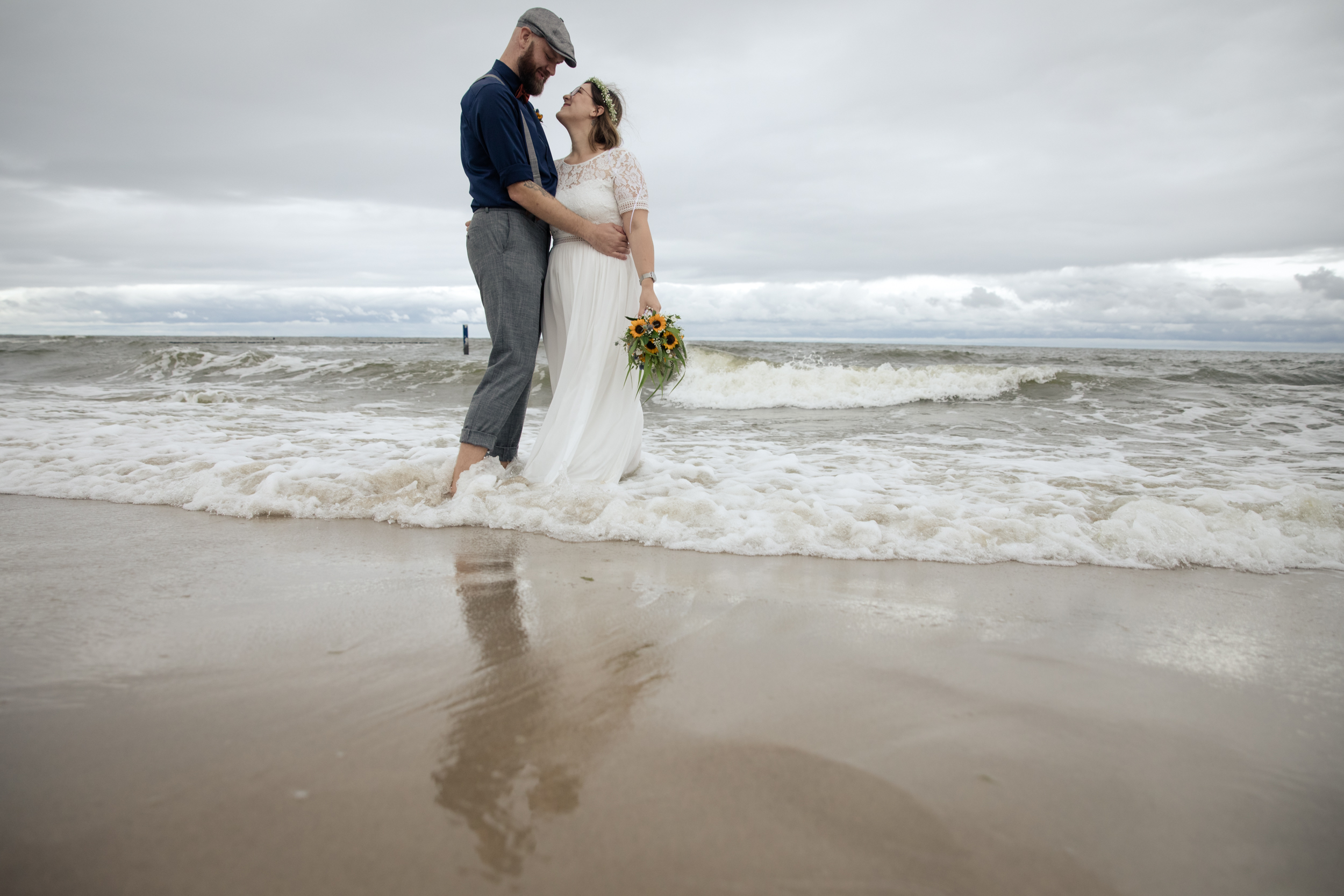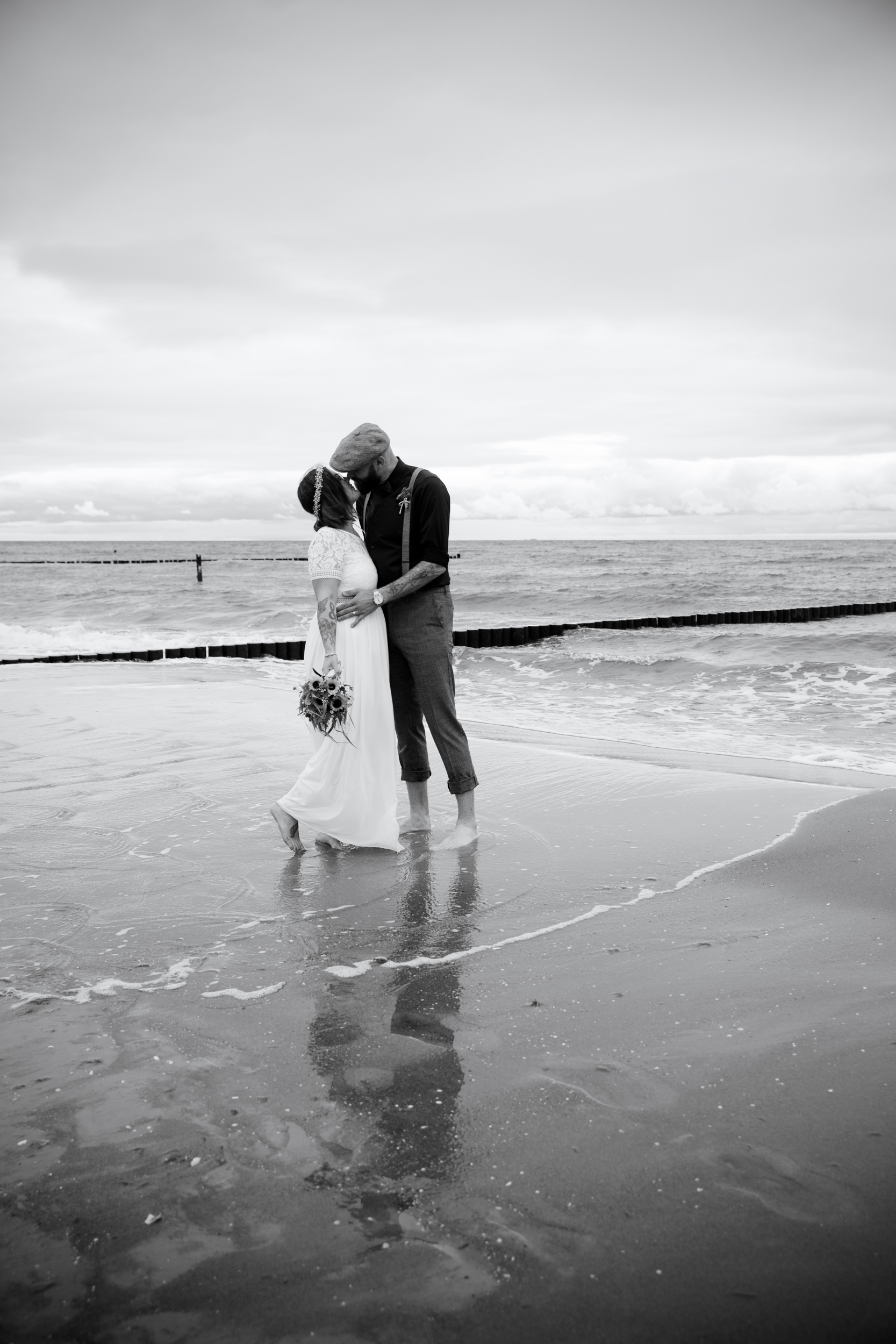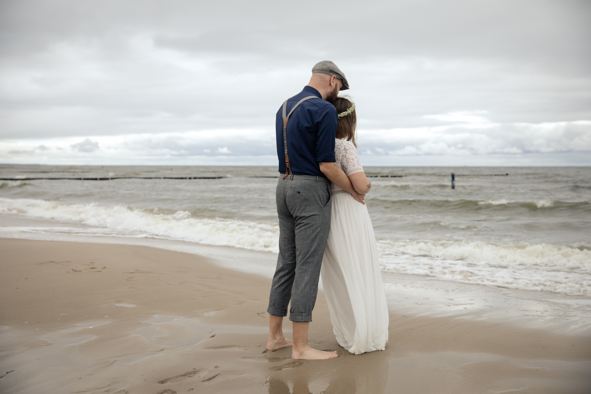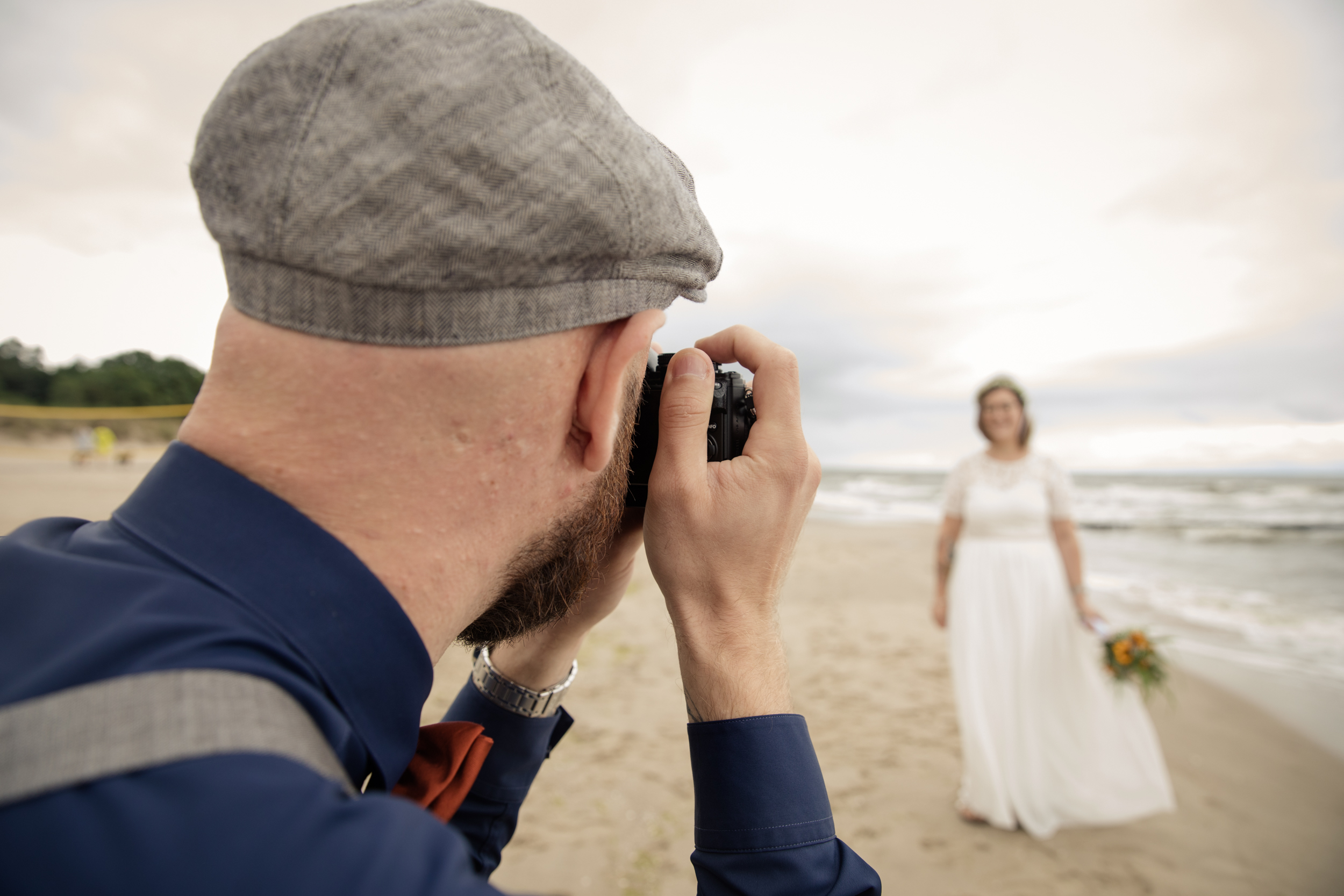 Nach der Trauung war die erste Aufregung weg und unser Hochzeitsspaziergang durch Koserow konnte starten. Wir hatten so einiges an Ideen auf unserem Zettel, also galt es keine Zeit zu verlieren, denn das Wetter war nicht zu 100% auf unserer Seite. Erste Station: natürlich, Strand! Die Ostsee zeigte sich an diesem Tag etwas stürmisch, aber wir ließen uns nicht abschrecken. Robert fotografiert selbst auch sehr gerne und so war es sein Wunsch, dass ich ihn dabei fotografiere, wie er seine hübsche Braut fotografiert. Ganz dem Motto also: Fotografin fotografiert Fotograf beim Fotografieren 😉