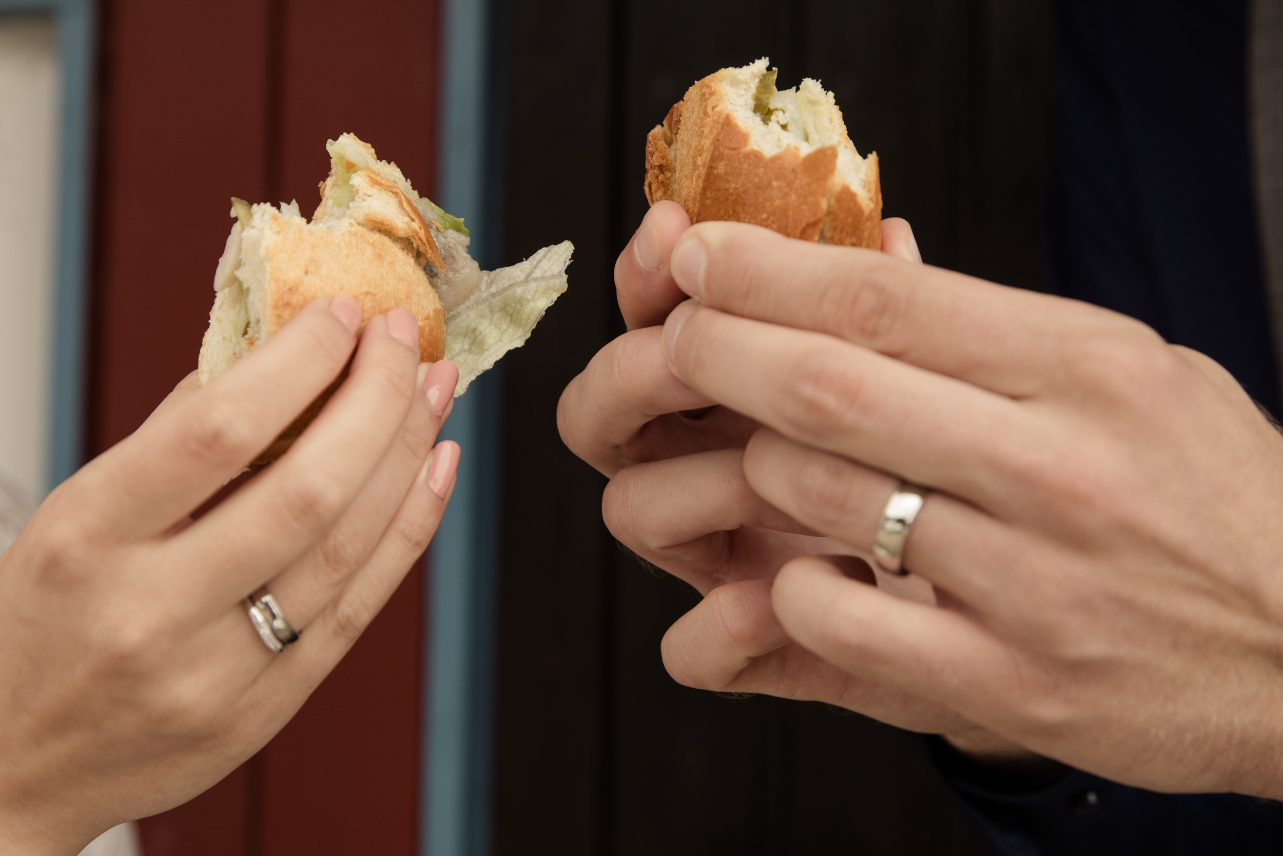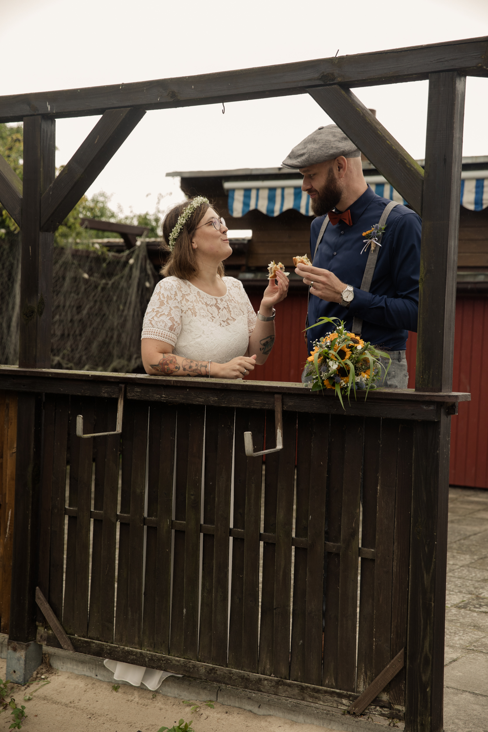 Nach der ersten Strandrunde wurde es Zeit für eine Stärkung. Und so besorgte Robert ein leckeres Fischbrötchen, der perfekte Hochzeitssnack auf Usedom. Frisch gestärkt prägten sich die beiden dann eine Koserow Münze und wir spazierten Richtung Steilküste und Küstenwald.