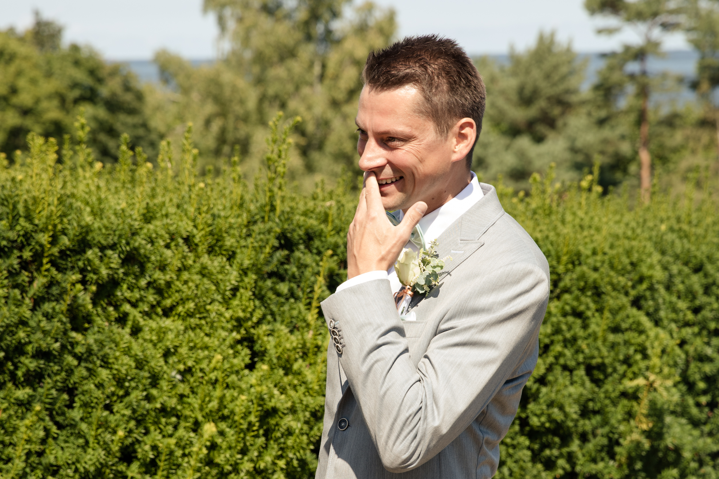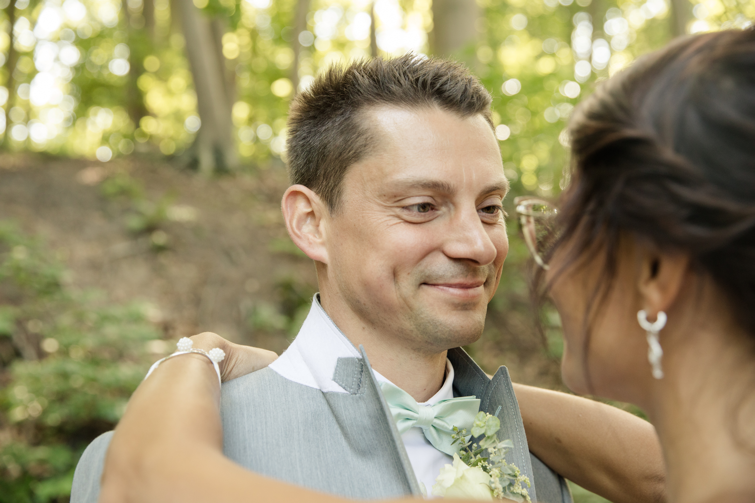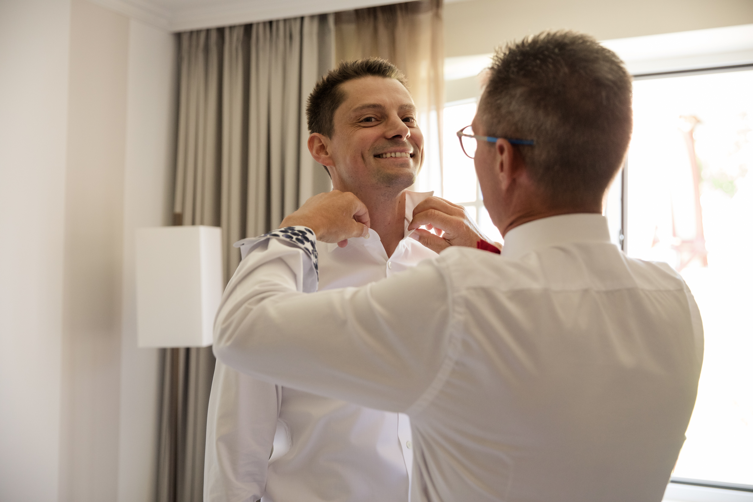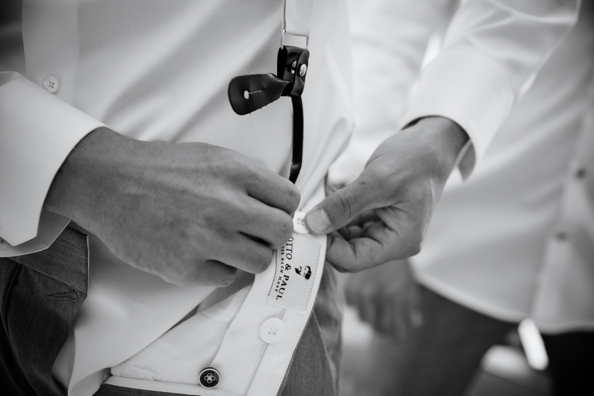 Natürlich schaue ich auch immer beim Bräutigam vorbei, um zu sehen, wie dort der Pegel der Aufregung ist und auch um kleine Details wie die Fliege oder die Manschettenknöpfe einzufangen. Auch Thomas war beim getting ready nicht allein und ich konnte seine Aufregung spüren.