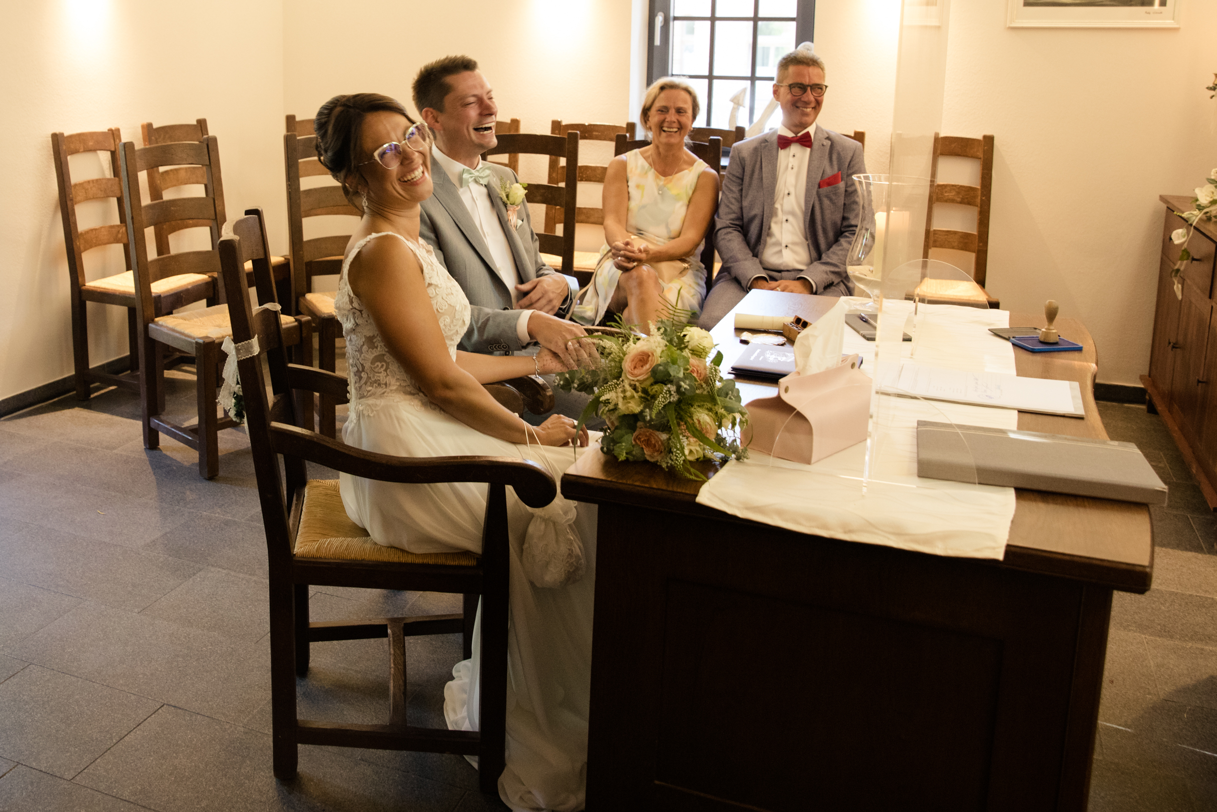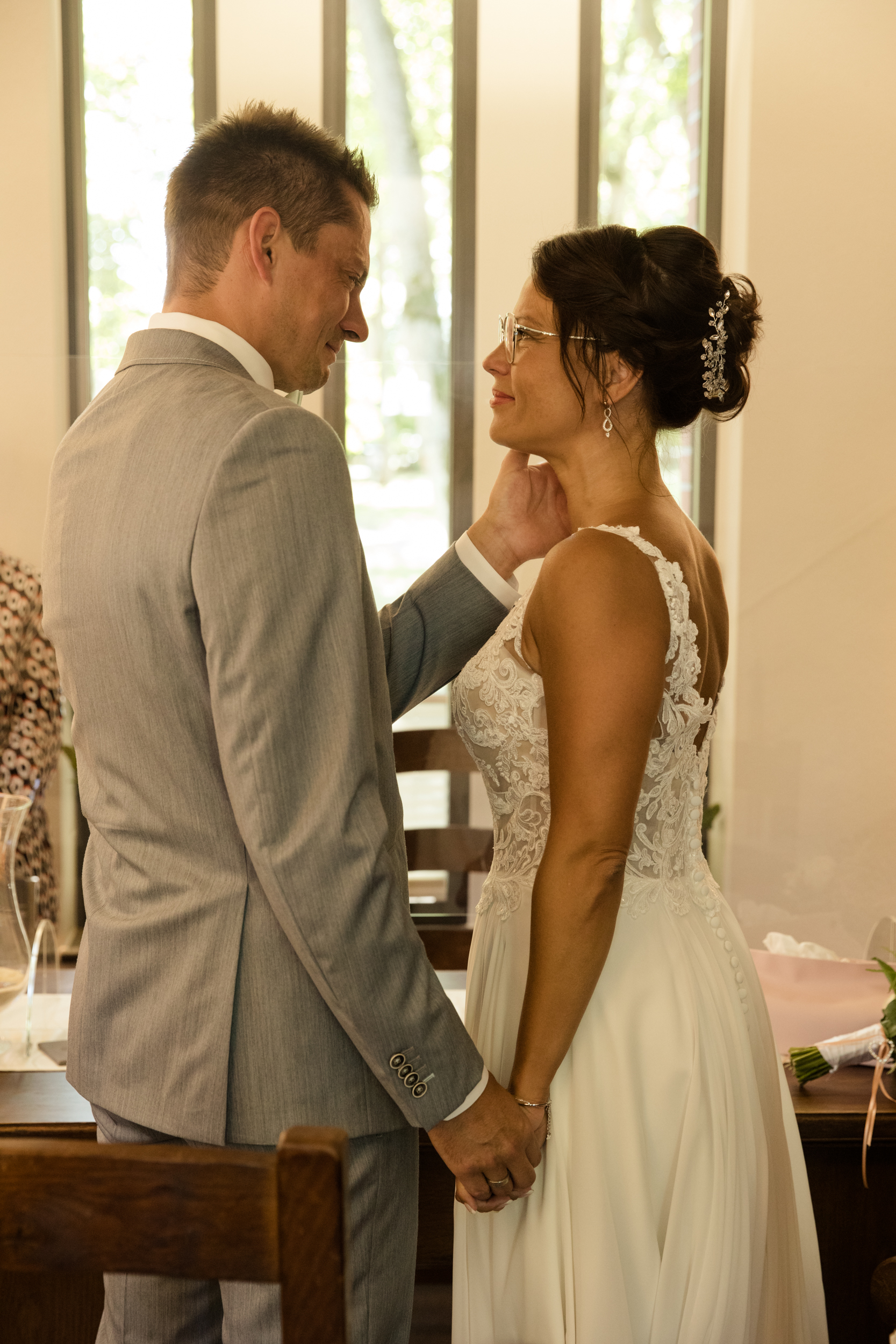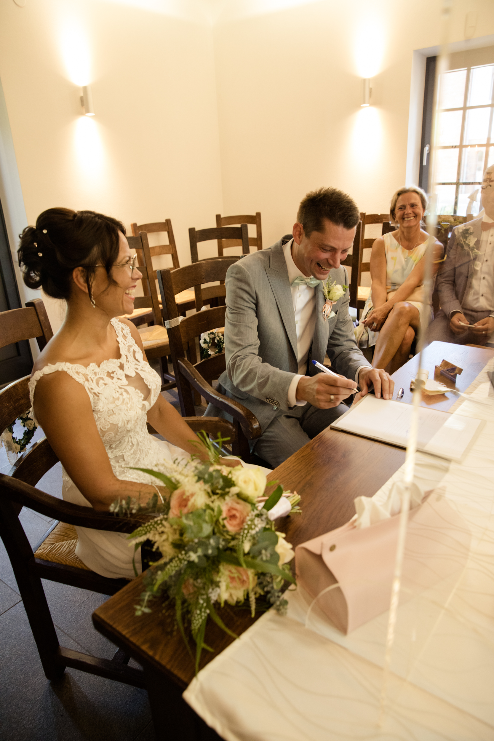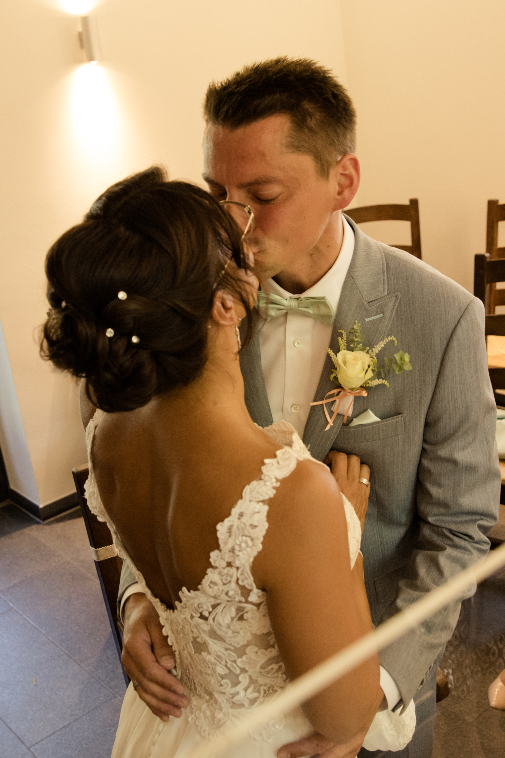 Der große Moment war gekommen und die beiden schritten gemeinsam mit schöner Musik zum Trautisch. Die Standesbeamtin hatte eine wundervolle und emotionale Rede vorbereitet und als kleines i-Tüpfelchen tauschten die beiden ein Eheversprechen aus. Der erste Kuss als Hochzeitspaar durfte natürlich auch nicht fehlen. Die ganzen Plexiglasscheiben machen es uns Fotografen gar nicht so einfach, diese Momente gebührend und ohne störende Scheibe zu fotografieren. Aber wo ein Wille, da ein Weg 😉