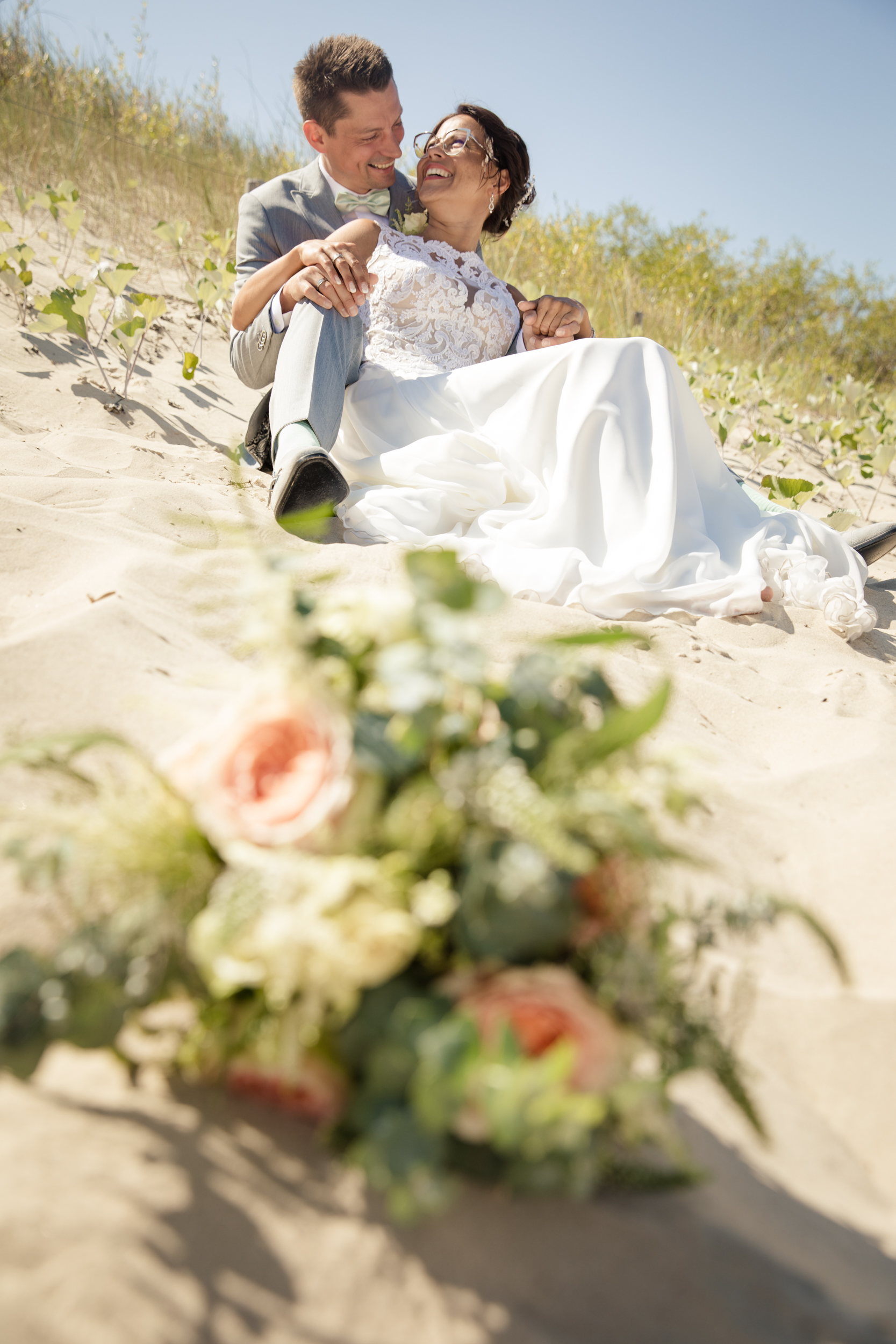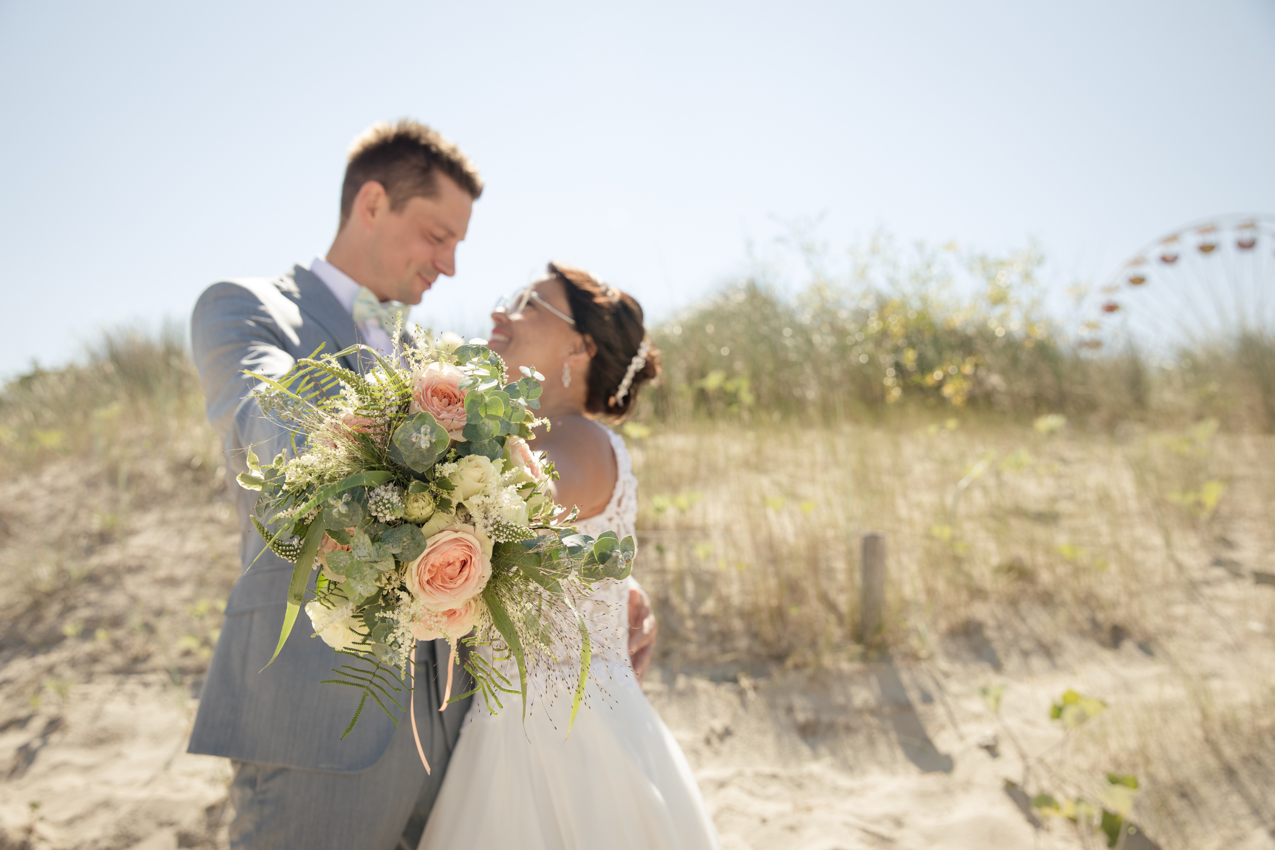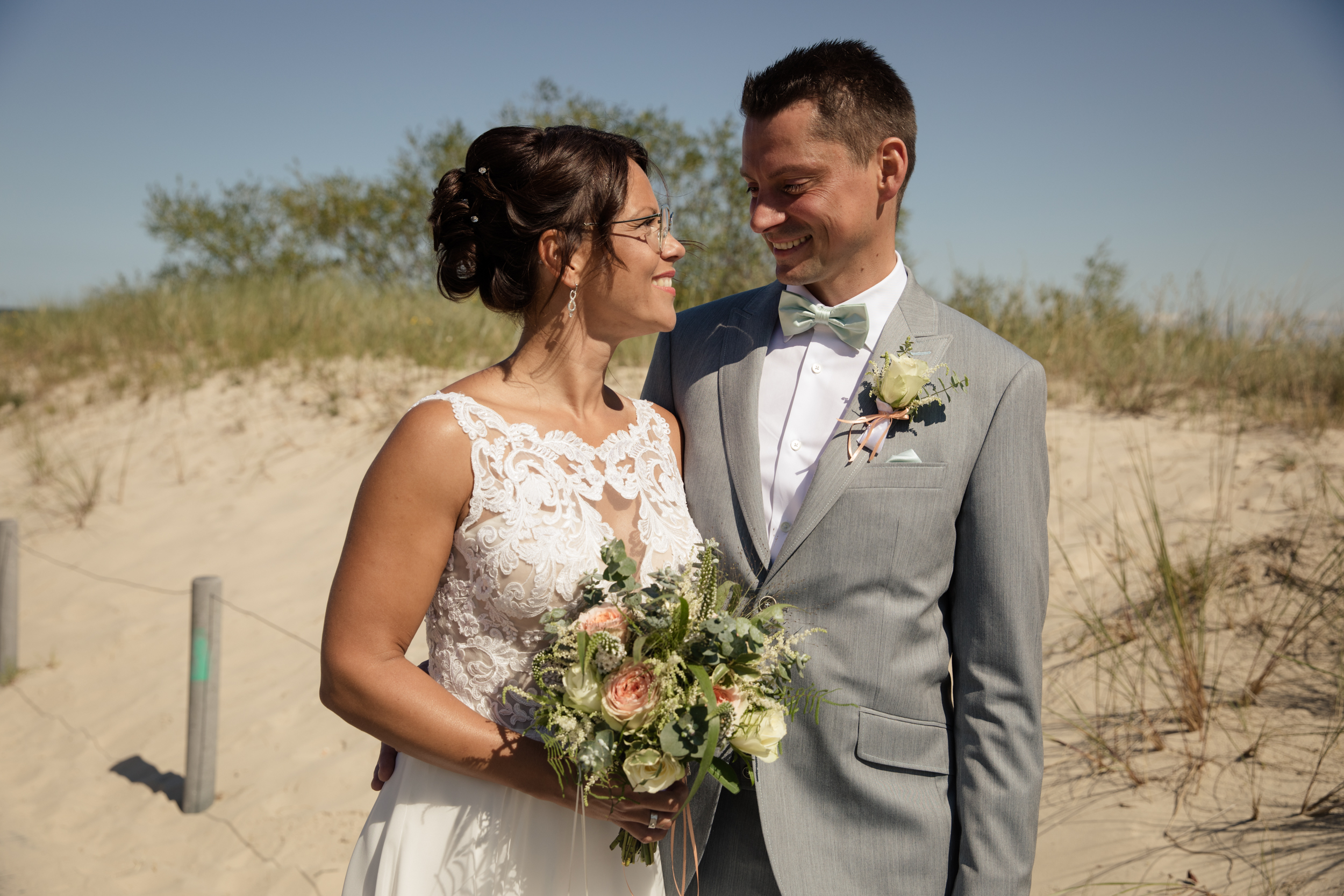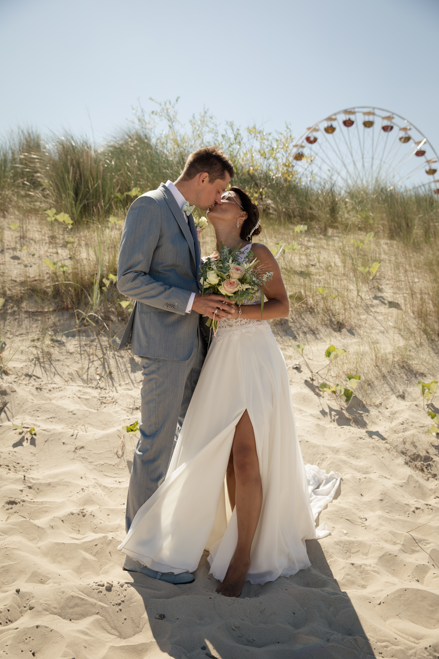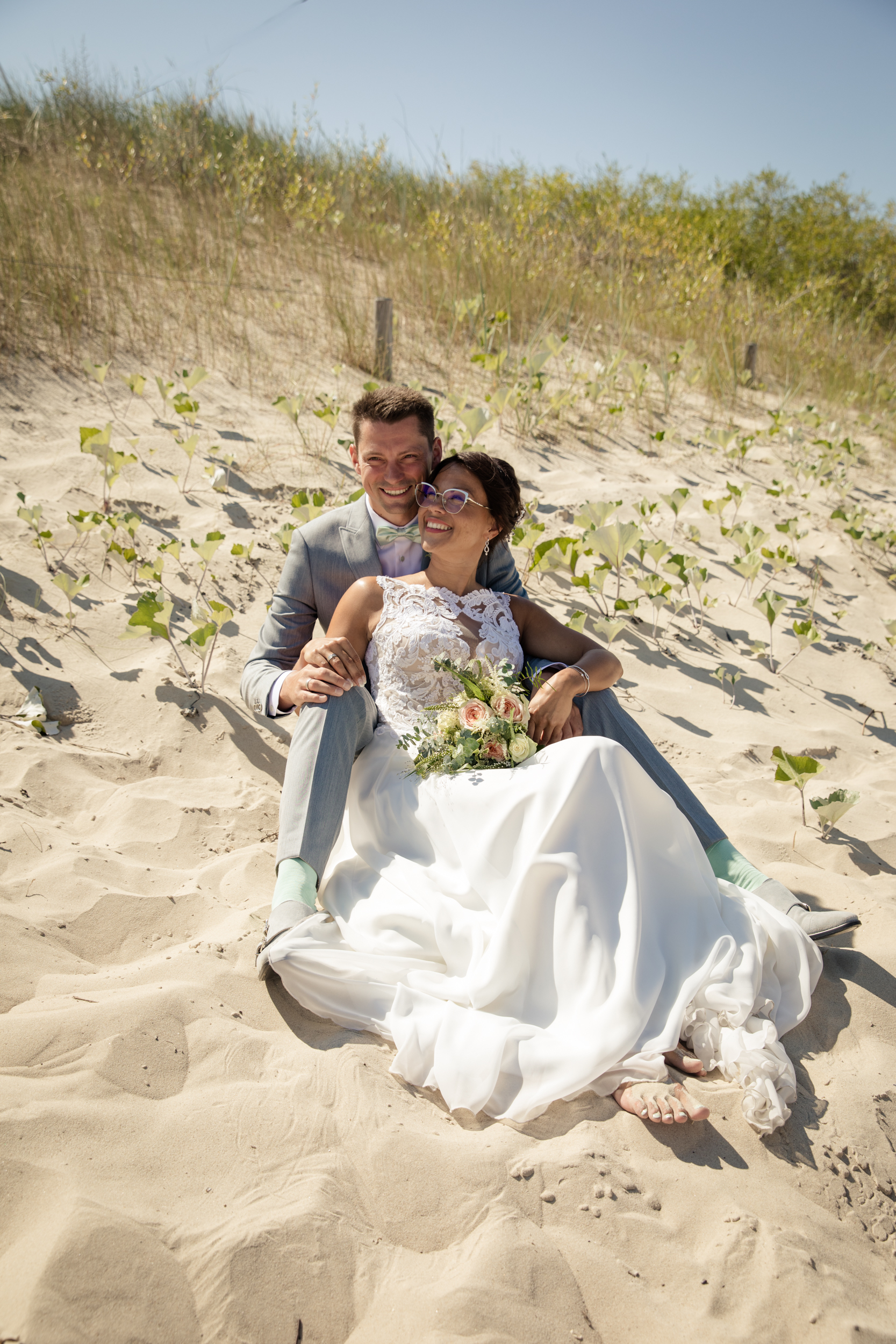 Nach der Trauung ging es dann direkt zum Strand. Wie zu erwarten war dieser rappelvoll und es war uns leider nur möglich, ein paar ungestörte Bilder am Dünenrand zu machen. Diese Fotos sehen jedoch immerhin so aus, als wenn wir ganz allein am Strand gewesen wären 😉