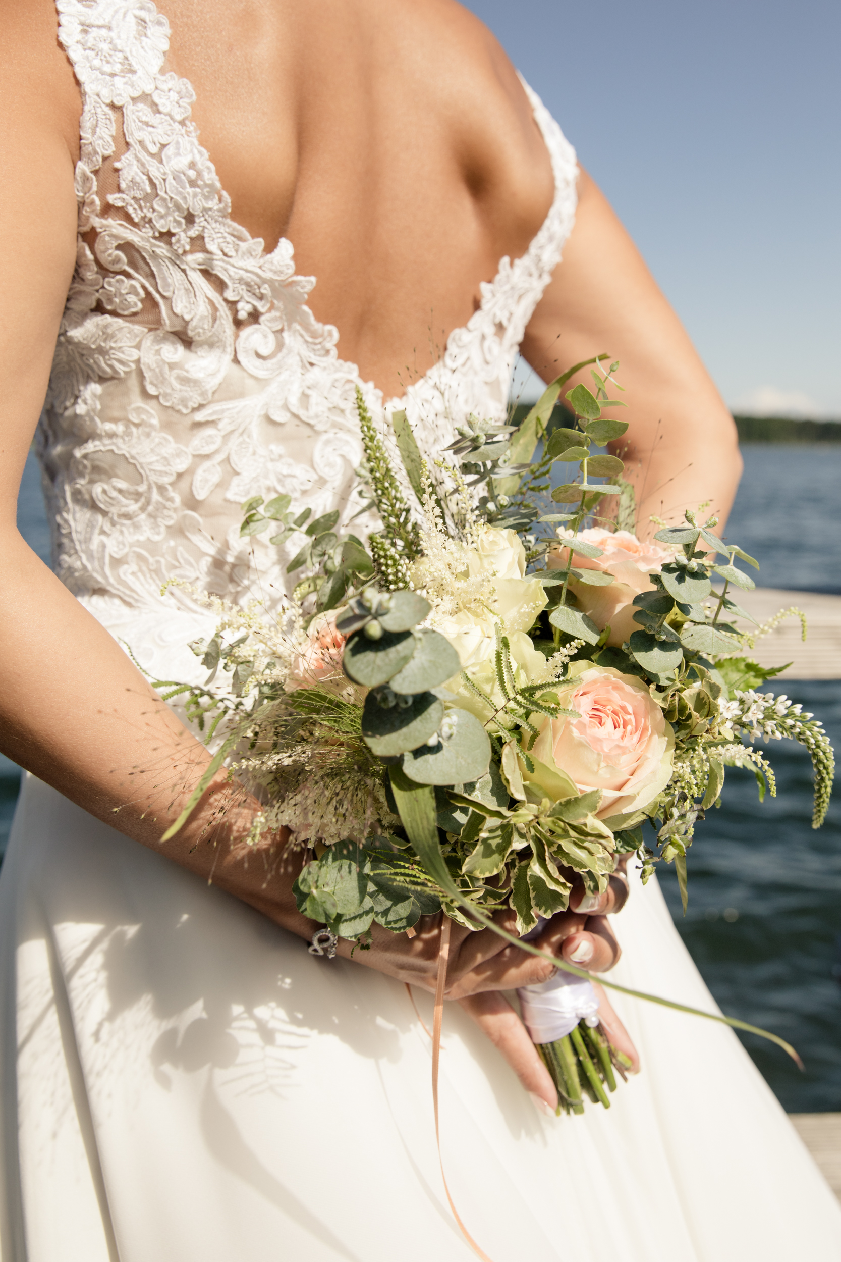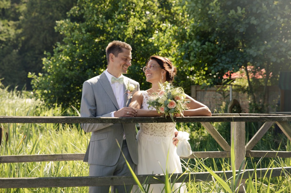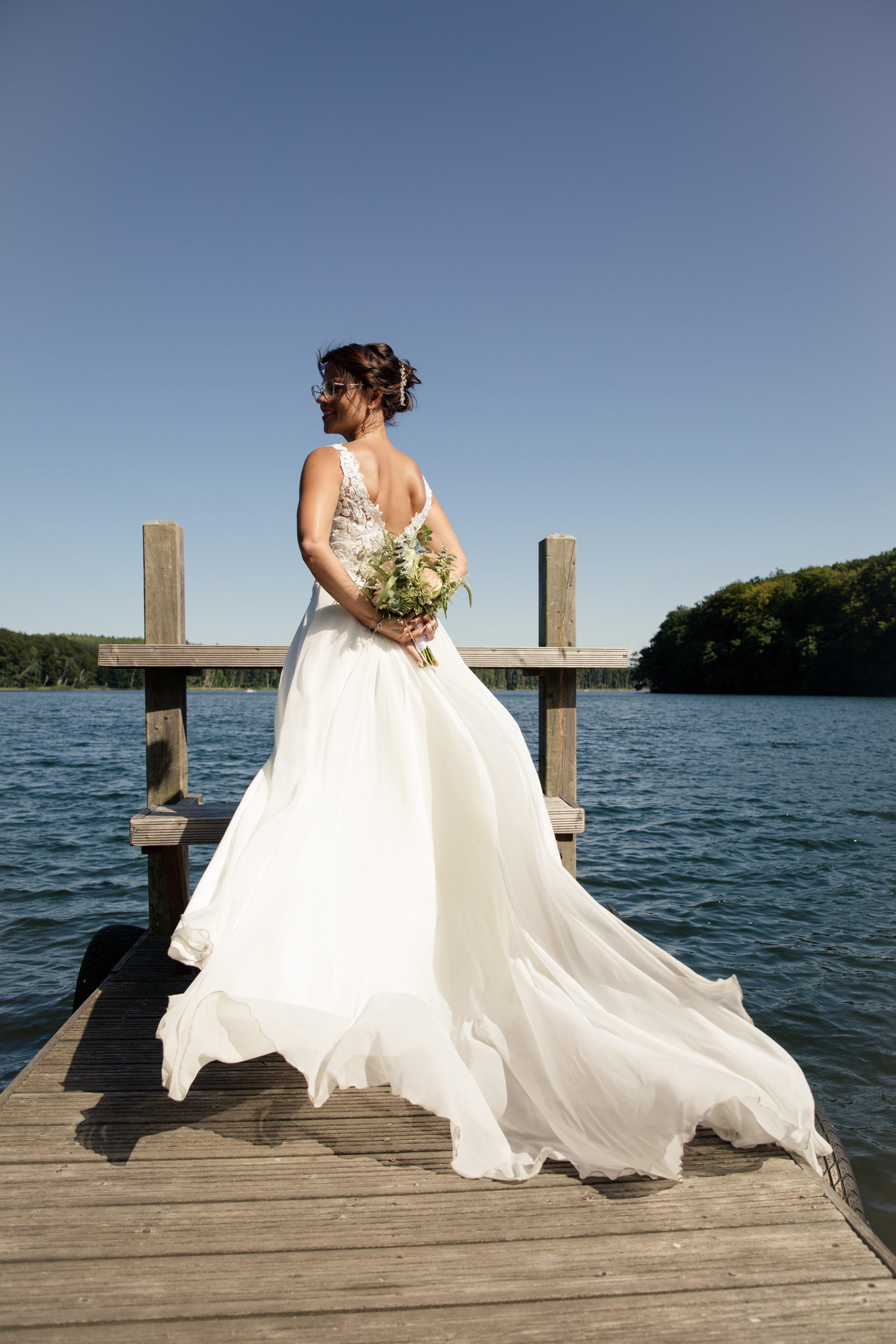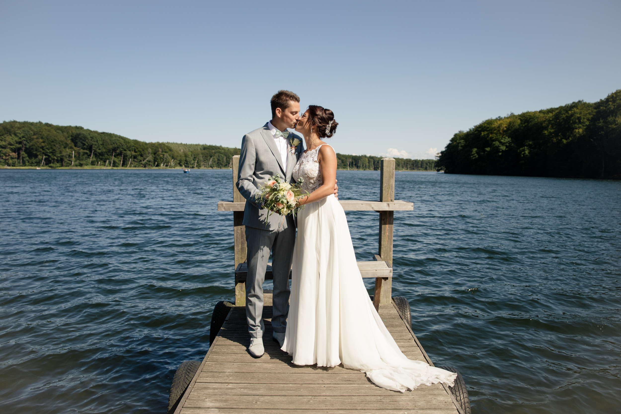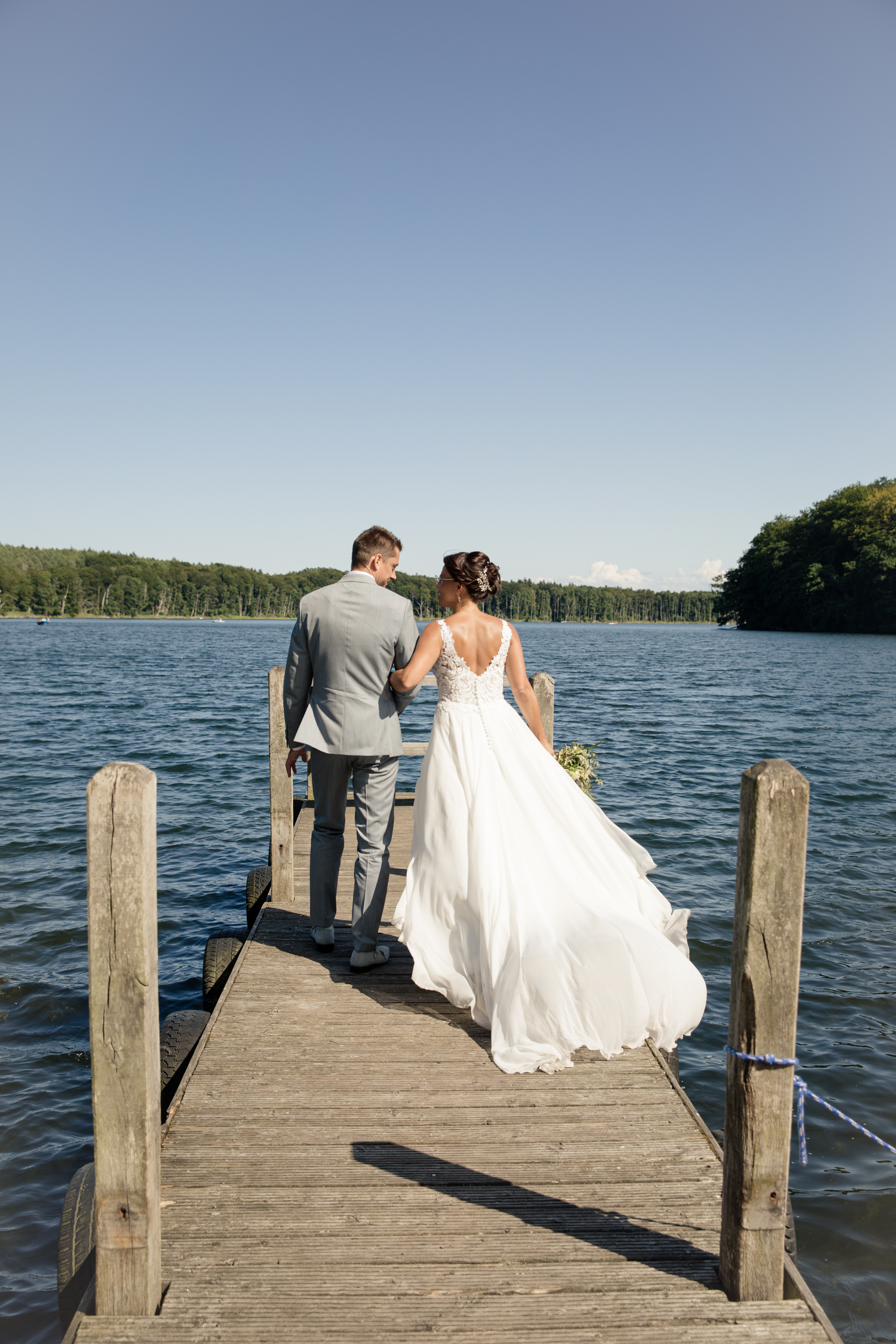 Gerade im Hochsommer empfehle ich meinen Paaren als Ausweichlocation den Wolgastsee. Denn hier können wir im Schatten der Bäume schöne Fotos entstehen lassen und sind halbwegs ungestört. Im Restaurant „Idyll am Wolgastsee“ kann man dann auch den restlichen Tag mit Blick auf den See verbringen. Auch Stefanie und Thomas hatten sich für diese Variante entschieden. Bevor es für die beiden zum entspannten Sektempfang ging, machten wir uns auf den Weg zum Hochzeitsspaziergang. Direkt am See gibt es auch einen Bootsanleger für Ruderboote und Tretboote und dieser eignet sich immer richtig gut für tolle Fotos. Der Wind brachte das Brautkleid ganz wunderbar zum Fliegen und die beiden hatten so viele liebevolle Details, welche wir in die Fotos miteinbauen konnten.