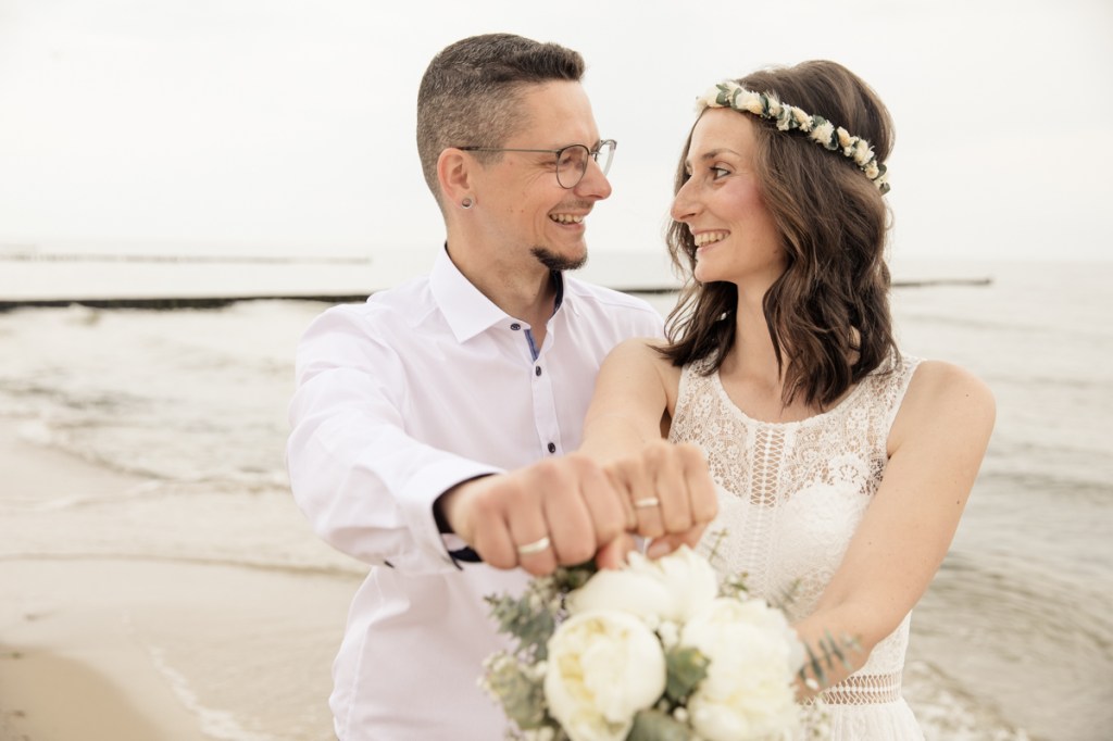 Nach der Trauung ging es dann für uns auf einen Fotospaziergang. Dabei hatten wir besonders viel Glück, denn vor der Trauung hat es noch in Strömen geregnet. Als wir uns aber auf den Weg machten, hörte es auf und so konnten ganz besonders schöne Bilder am Strand entstehen. Normalerweise wäre dieser gut gefüllt gewesen, durch den Regen im Vorfeld, hatten wir jedoch nur ein paar Spaziergänger.