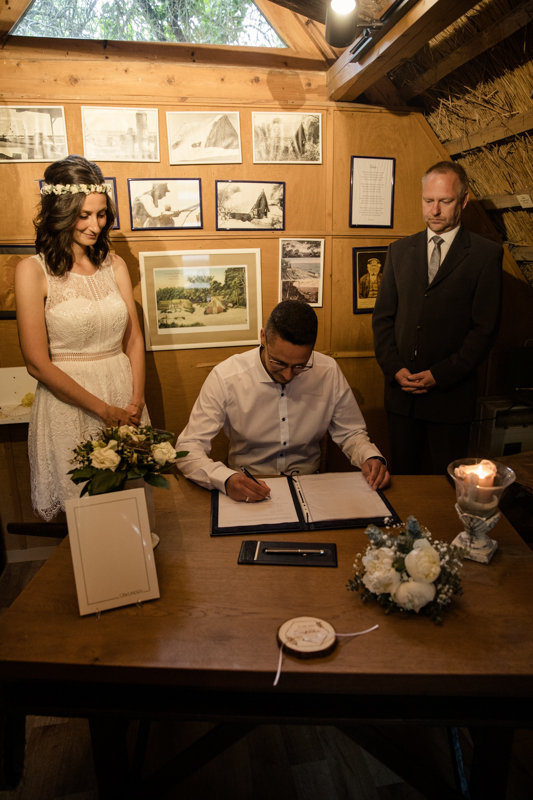 Das Ja-Wort und die Ringe tauschten Braut und Bräutigam nach einer Ansprache des Standesbeamten und natürlich war auch der erste Kuss ein ganz besonderer Moment für die beiden. Daraufhin wurde dann noch die Eheschließung unterschrieben, um das Ganze zu besiegeln.