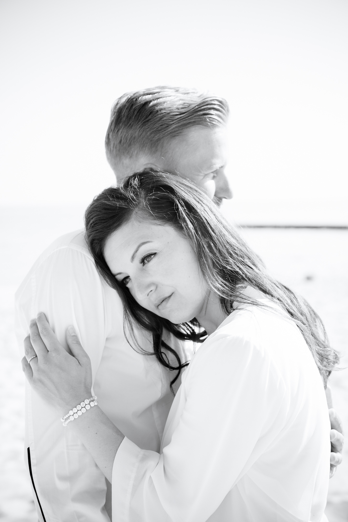 Damit vor allem im Sommer romantische Fotos ohne viele andere Menschen entstehen können, ist der Zeitpunkt des Shootings entscheidend. Deshalb vergebe ich meist nur noch am frühen Morgen und am späteren Nachmittag/ Abend Termine. Gern zu den Zeiten, zu welchen andere Urlaub am Frühstücks- oder Abendbrotstisch sitzen. So traf ich mich auch mit Marius und Santina am frühen Morgen, kurz bevor die Rettungsschwimmer ihre Fahnen setzten. Ein Morgen am Strand ist schon etwas magisches. Oft ist die See sehr ruhig und das Meer glitztert. Gerade zu Beginn des Shootings lasse ich euch immer ein wenig spazieren, zum einen, um die Atmosphäre zu genießen, aber auch damit ihr euch an meine Kamera gewöhnen könnt.