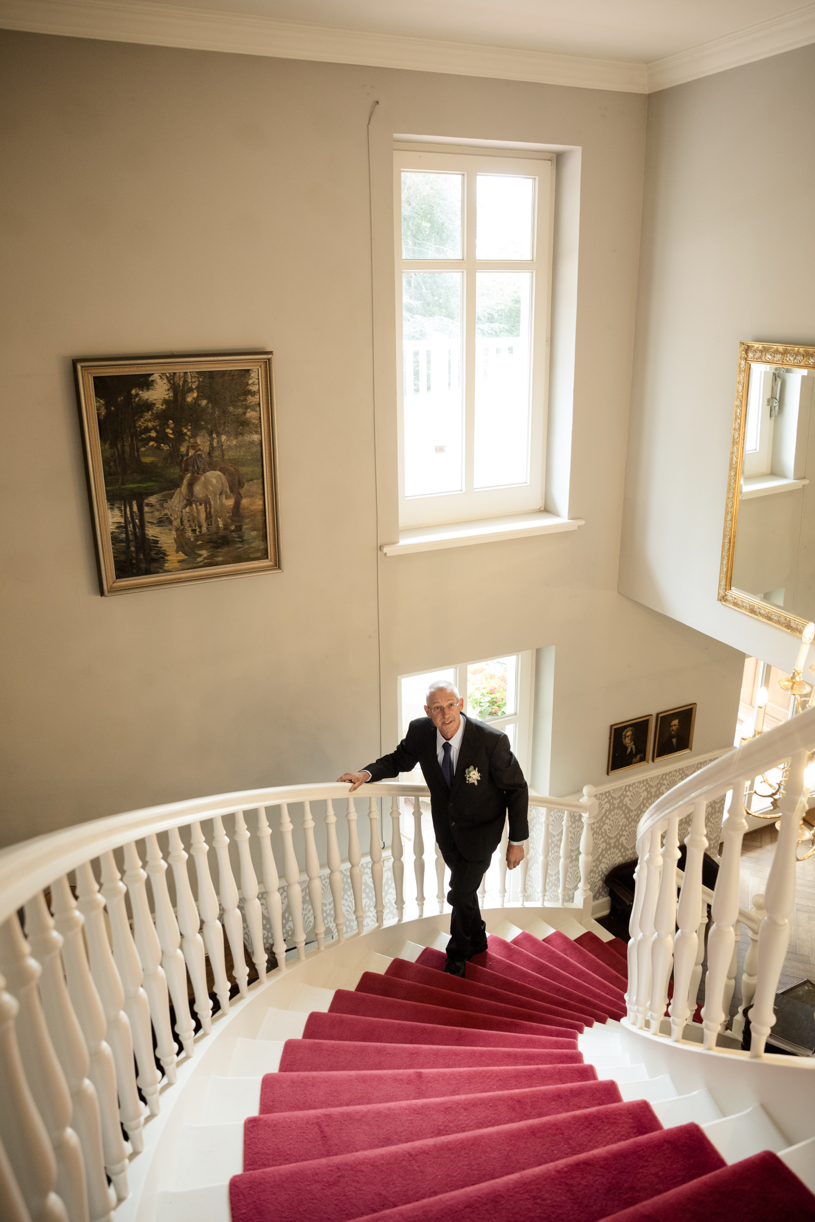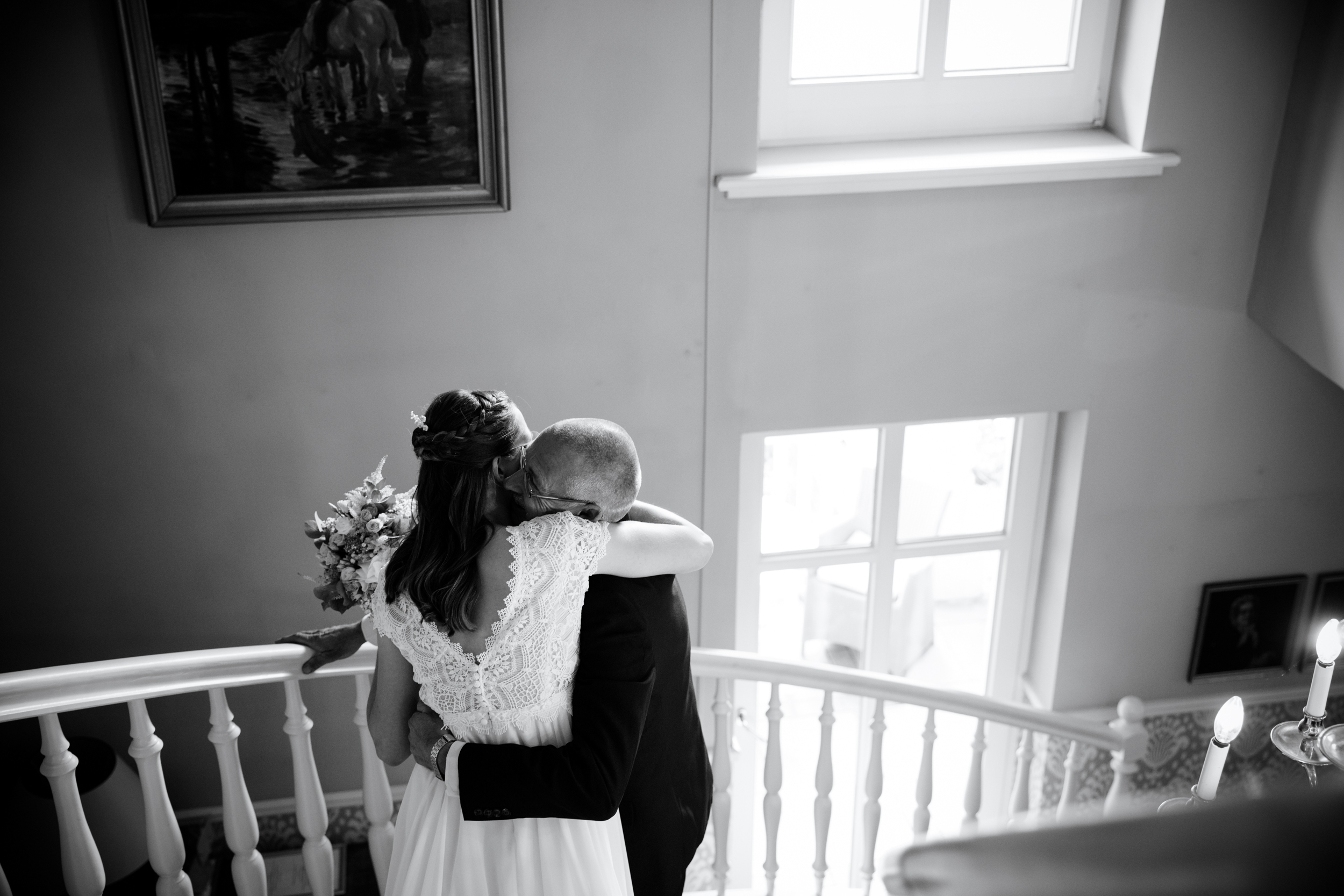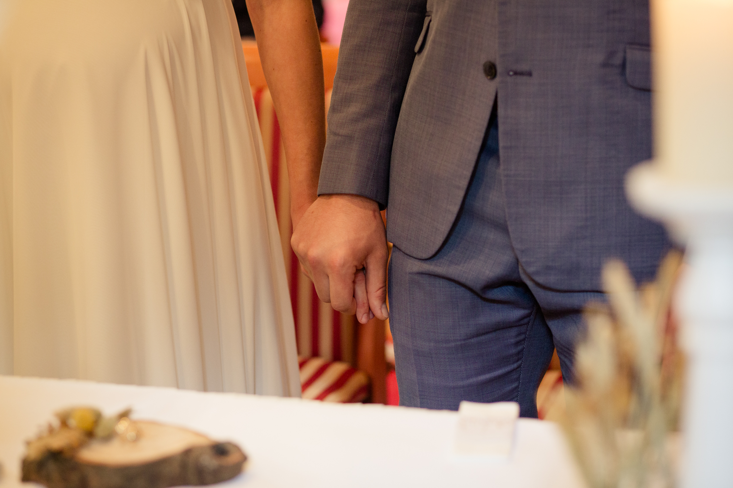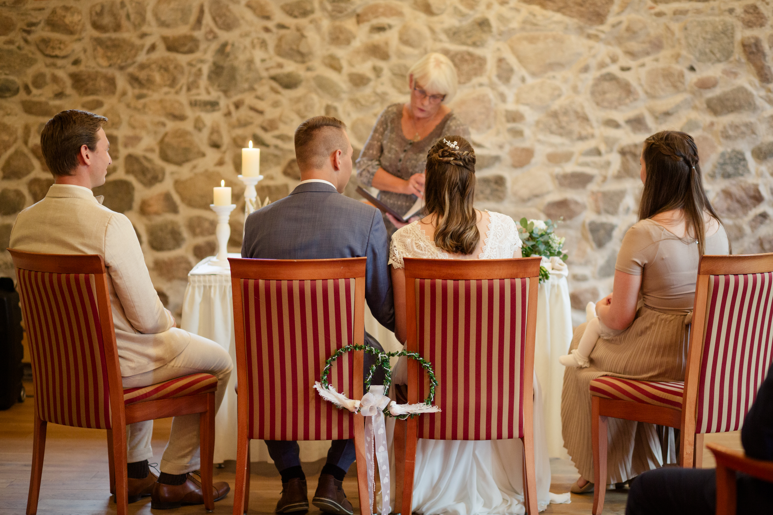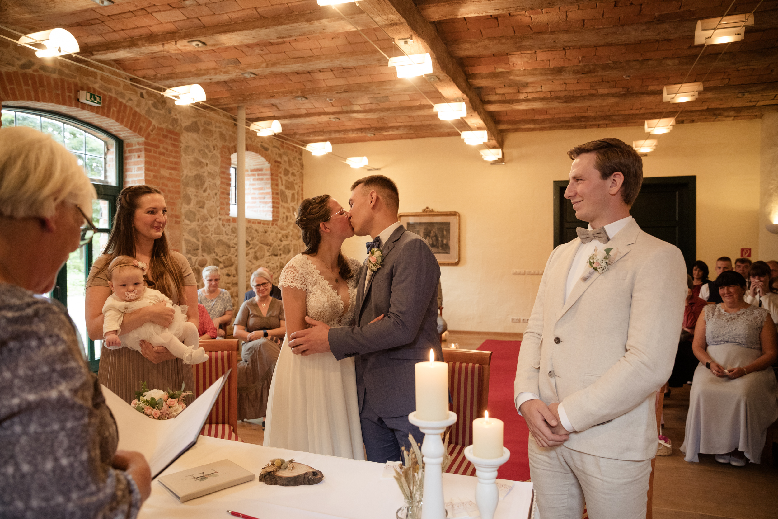 Die standesamtliche Zeremonie fand im alten Pferdestall des Gutshauses statt und war äußerst ergreifend. Die kleine Schwester der Braut war so gerührt, dass vor Freude Tränen flossen. In solchen Momenten muss ich mich stets beherrschen, da ich sonst durch den Kamerasucher nichts mehr erkennen kann. Pauls Bruder, der erst kürzlich selbst geheiratet hatte, erwies sich als ausgezeichneter Trauzeuge und half ihm, die Aufregung zu bewältigen. Die kleine Tochter der Trauzeugen brachte eine gewisse Unbeschwertheit in die Zeremonie, denn sie hatte keine Geduld für lange Reden und Knutscherei. Auf diese Weise verpasste sie auch den ersten Kuss des Ehepaares und den Ringwechsel.
