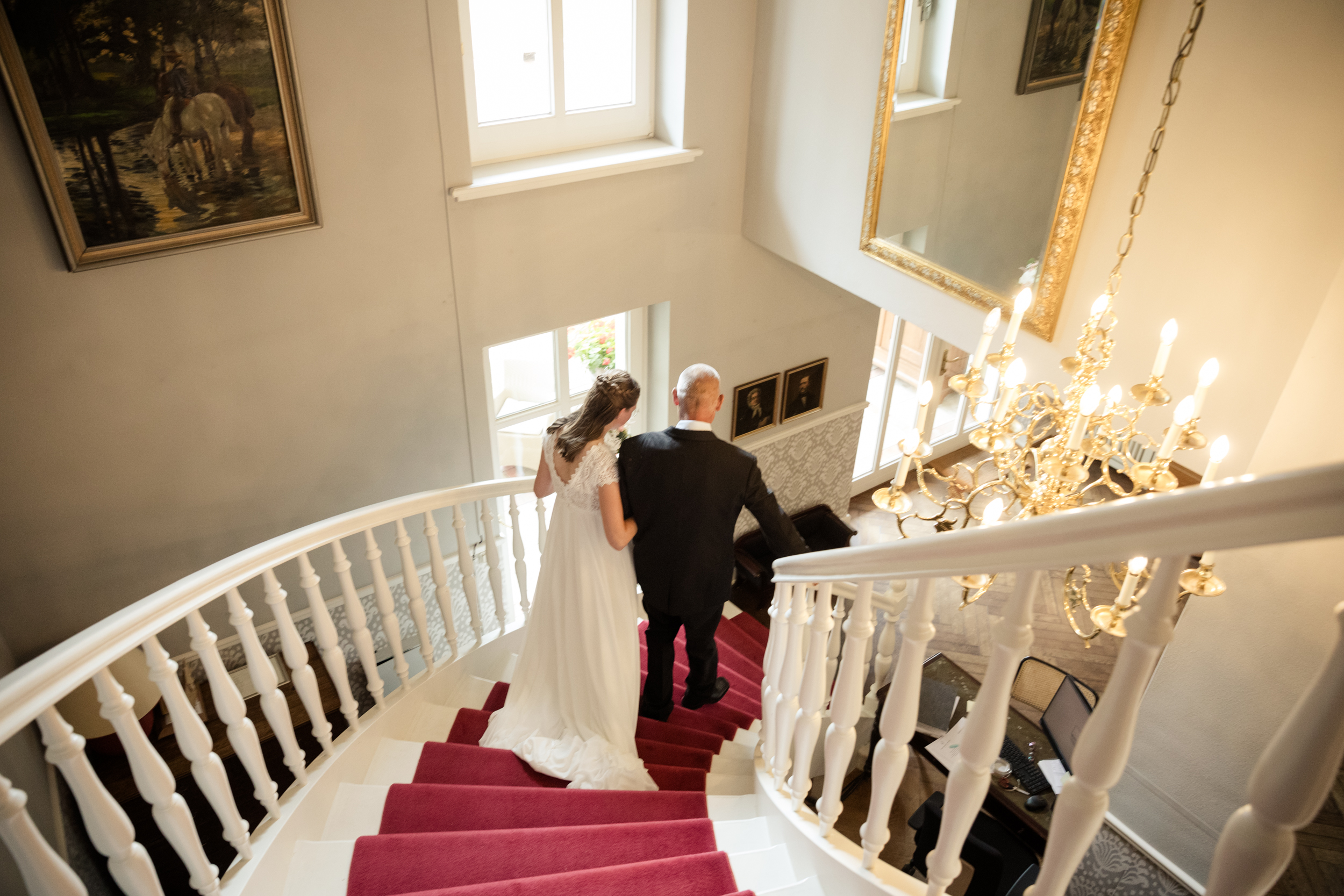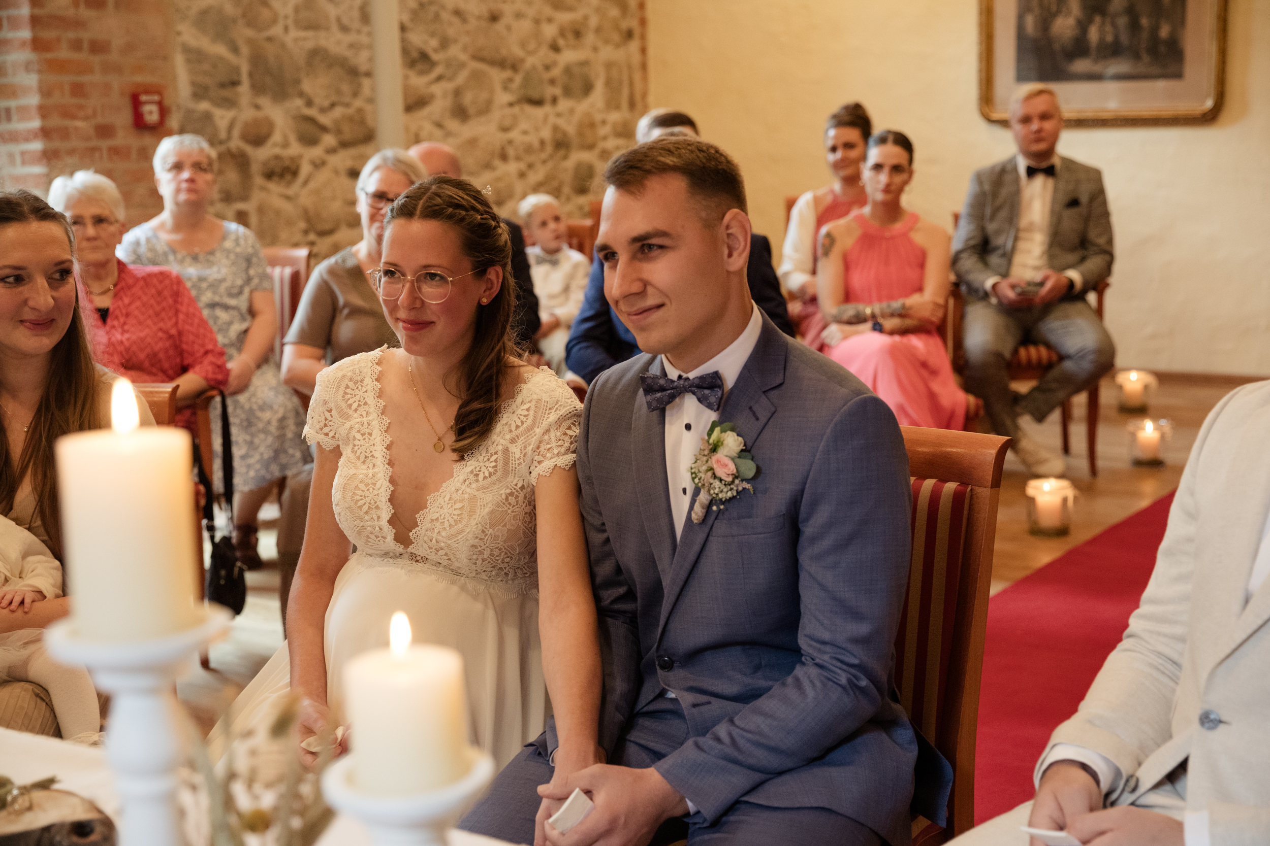 Julias Papa holte seine Tochter im Gutshaus ab. Ein so schöner Moment, als er seine Tochter das erste mal im Hochzeitskleid sah. Auch Pauls Aufregung und Vorfreude auf seine schöne Braut waren spürbar. Julia, hochschwanger und strahlend schön, betrat das Trauzimmer am Arm ihres Vaters und eroberte die Herzen aller Anwesenden im Sturm. Die Vorfreude auf das kommende Baby verlieh der Zeremonie eine ganz besondere Atmosphäre und berührte die Gäste zutiefst.