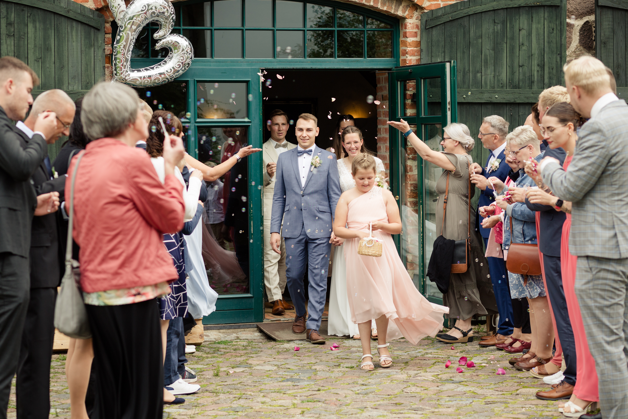 Nach der Trauung wurden Julia und Paul von ihren Gästen mit einem herzlichen Empfang mit Seifenblasen begrüßt. Die Gäste ließen die beiden ein Herz ausschneiden und Paul schnappte sich seine Julia, um sie durch das Herz zu tragen. Anschließend nutzten wird die Zeit für Gruppenfotos in der Gutsanlage.
