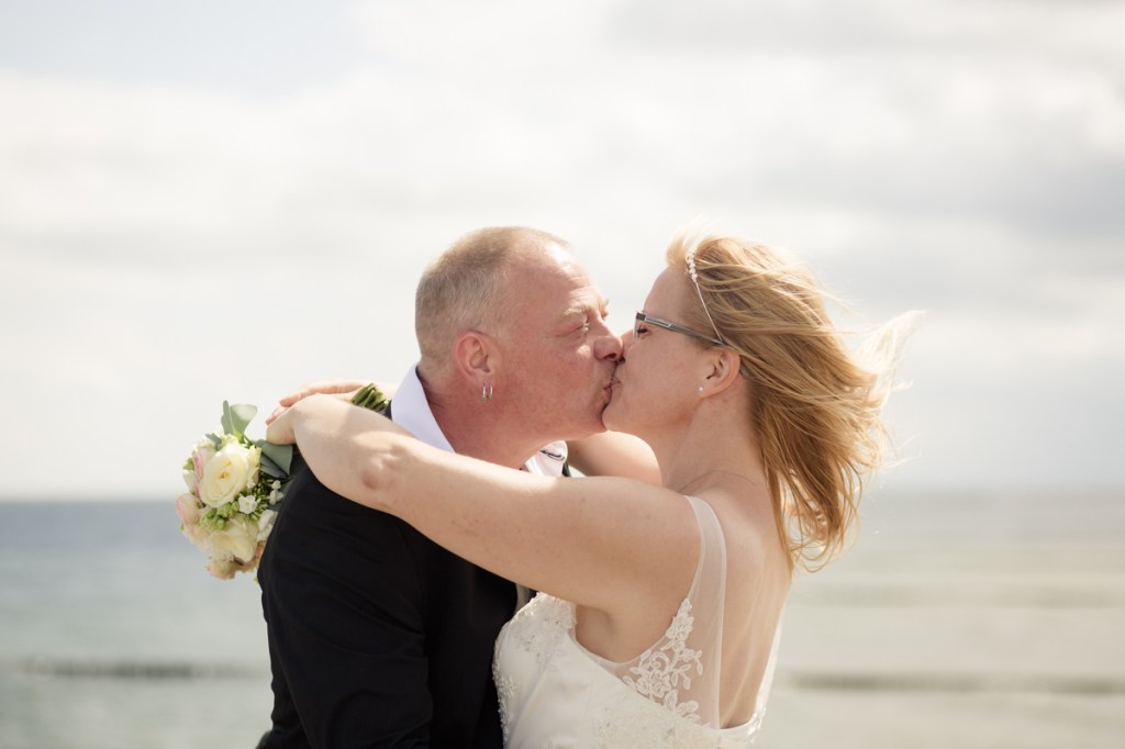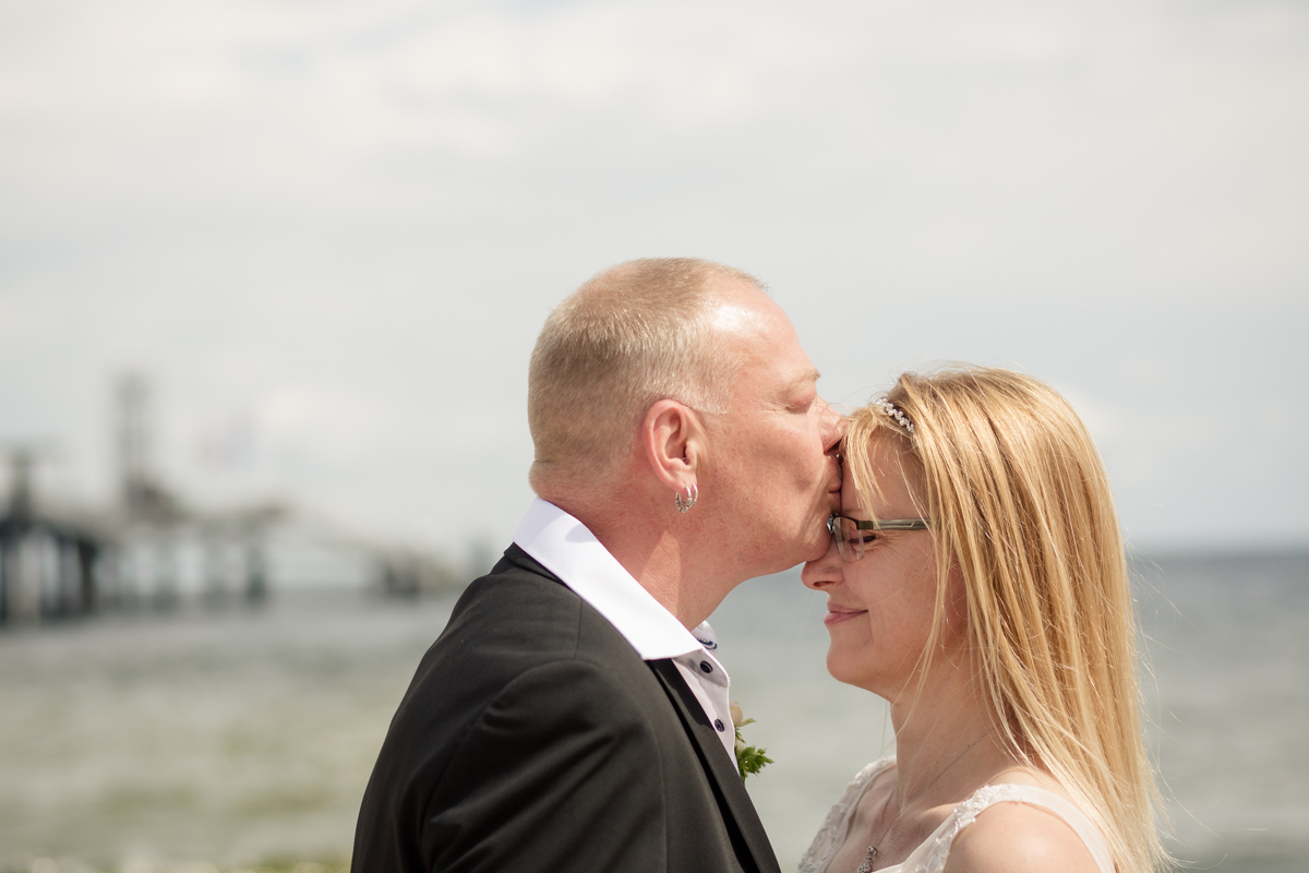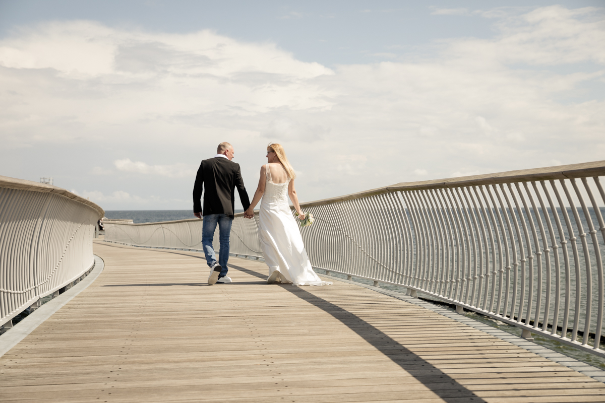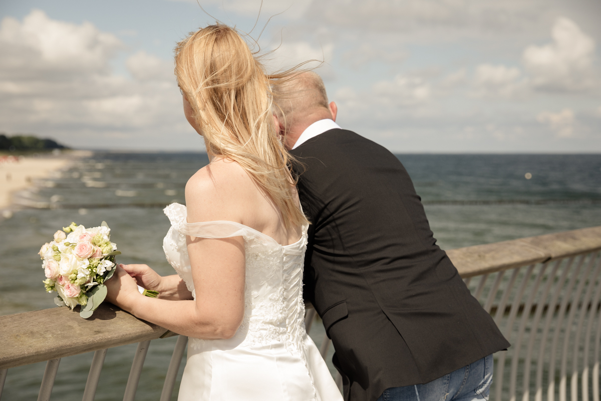 Nach der Trauung machten wir uns auf den Weg zum Fotoshooting. Ein großer Wunsch von Renè und Bianca war es, besondere Bilder auf der Seebrücke von Koserow zu machen. Zwar war es dort recht belebt, aber mit ein wenig Geduld fanden wir immer wieder ruhige Momente und ein paar Meter Platz für schöne Aufnahmen. Die Seebrücke bot uns eine fantastische Kulisse, die perfekt zur Atmosphäre des Tages passte. Die sanfte Brise und das Rauschen des Meeres sorgten für eine entspannte und romantische Stimmung, die wir in den Bildern wunderbar einfangen konnten.