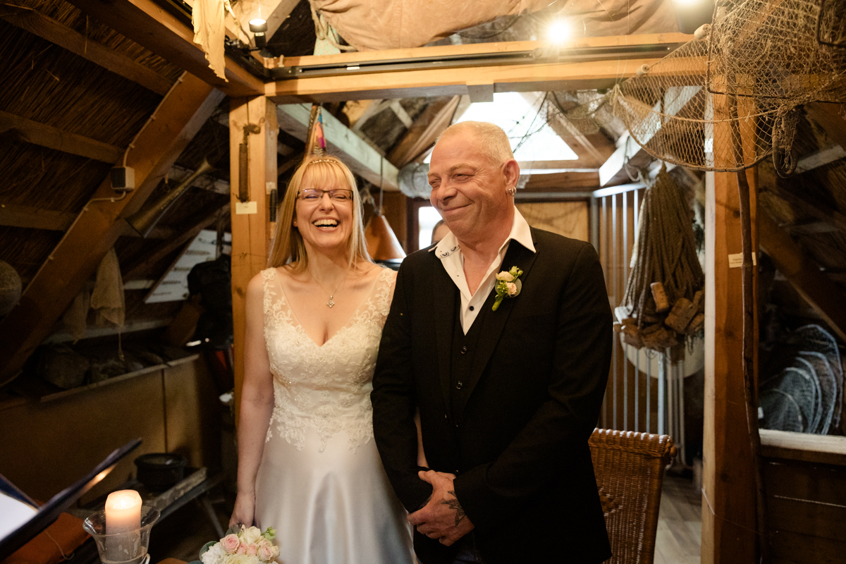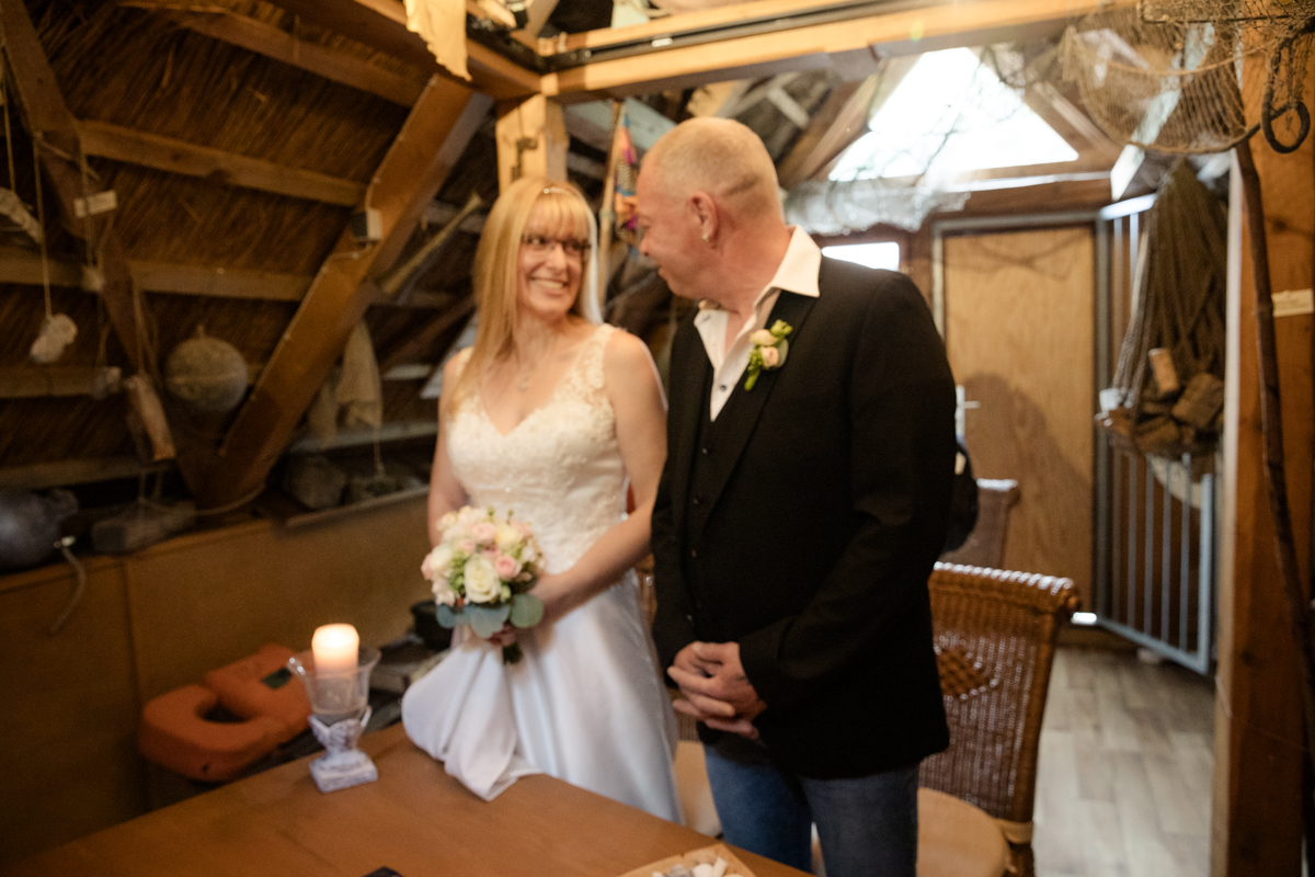 Die Salzhütten in Koserow präsentierten sich an diesem Sommertag von ihrer allerschönsten Seite. Der Duft von blühendem Lavendel lag in der Luft, und überall summten Bienen und Schmetterlinge – ein traumhaftes Szenario, das eine besondere, fast magische Atmosphäre schuf. Bianca war ganz schön aufgeregt, und sie war nicht die Einzige. Auch der Standesbeamte, der spontan für einen erkrankten Kollegen eingesprungen war, meisterte die Zeremonie mit viel Herz und Professionalität. Die spontane Veränderung brachte nur ein wenig zusätzliche Aufregung, was der Zeremonie aber keinen Abbruch tat. Stattdessen sorgte es für ein sehr herzliches und lebendiges Erlebnis, das allen in Erinnerung bleiben wird.