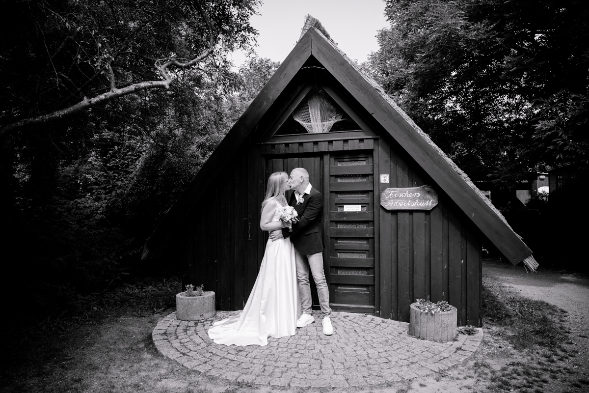 Die Salzhütten in Koserow präsentierten sich an diesem Sommertag von ihrer allerschönsten Seite. Der Duft von blühendem Lavendel lag in der Luft, und überall summten Bienen und Schmetterlinge – ein traumhaftes Szenario, das eine besondere, fast magische Atmosphäre schuf. Bianca war ganz schön aufgeregt, und sie war nicht die Einzige. Auch der Standesbeamte, der spontan für einen erkrankten Kollegen eingesprungen war, meisterte die Zeremonie mit viel Herz und Professionalität. Die spontane Veränderung brachte nur ein wenig zusätzliche Aufregung, was der Zeremonie aber keinen Abbruch tat. Stattdessen sorgte es für ein sehr herzliches und lebendiges Erlebnis, das allen in Erinnerung bleiben wird.