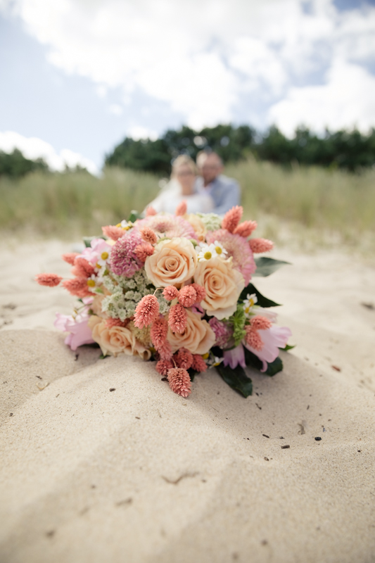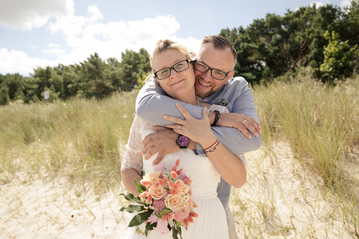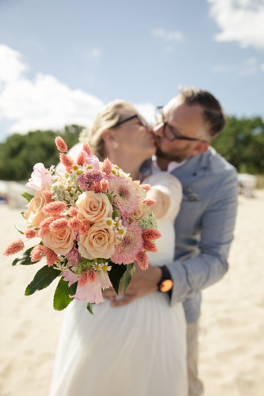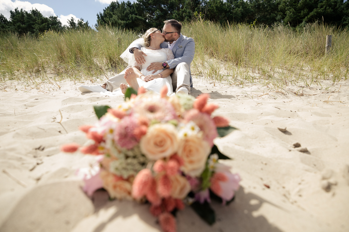 Nach der Zeremonie begann das Shooting – ein Highlight für Claudia und Michael. Wir starteten mit Gruppenfotos in unterschiedlichen Konstellationen, bevor ich mich ganz auf das Brautpaar konzentrierte. In Zinnowitz bieten sich zahlreiche wunderschöne Fotomotive: von den Dünen und Strandkörben bis hin zum weiten Sandstrand. Besonders der farbenfrohe Brautstrauß von Claudia war ein detailreiches Highlight, das wir gekonnt in Szene setzten.